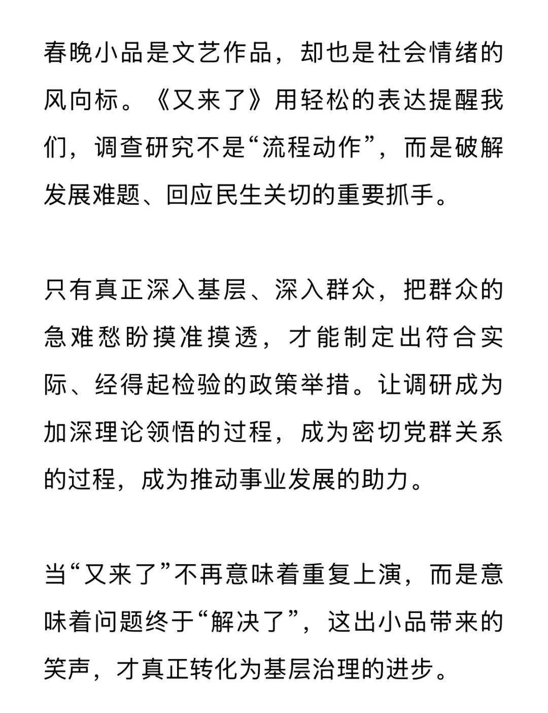 从“老三套”的敷衍提问,到“注水报告”的文字游戏;从“避重就轻”的选择性失明,到“责任下移”的甩锅大法;调研时热热闹闹走访座谈,笔记本记满问题清单,但结束后“研”而不“用”。小品《又来了》用一个个生动的细节,勾勒出扎堆调研、重复调研,不解决实际问题的官僚主义和形式主义作风。