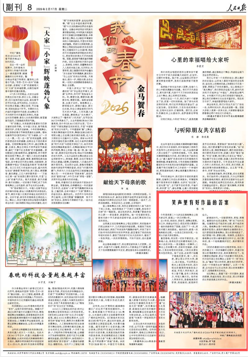 2月17日,演员蔡明在《人民日报》副刊发布署名文章《笑声里有好作品的答案》。