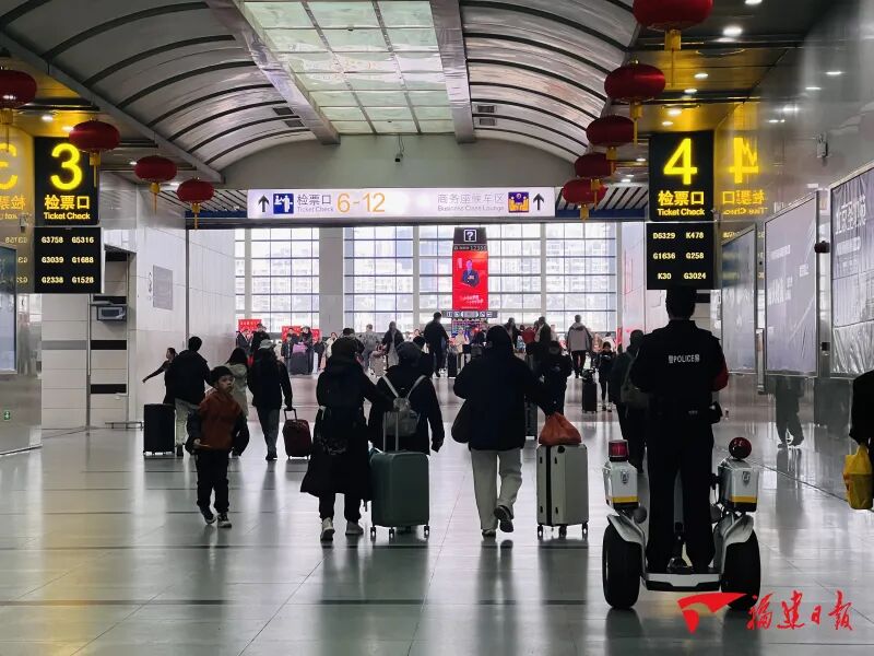 在福州火车站候车厅内,福州站派出所民警操作平衡车,移动巡警。陈欢欢 摄