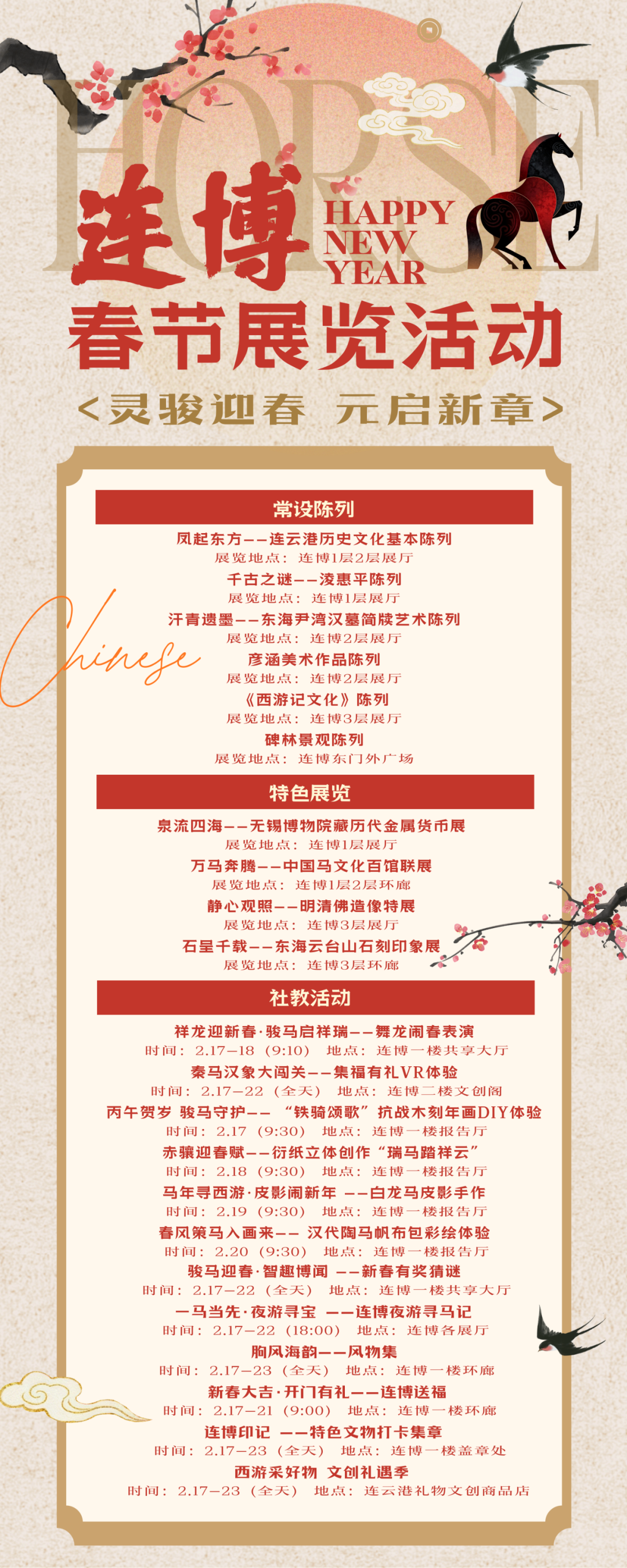 假日期间,连博各展厅及各项公共设施正常开放。凤起东方——连云港历史文化基本陈列试运行开放,泉流四海——无锡博物院藏历代金属货币展重磅推出,更有“丙午贺岁·博物馆里过大年”系列活动期待您的参与。