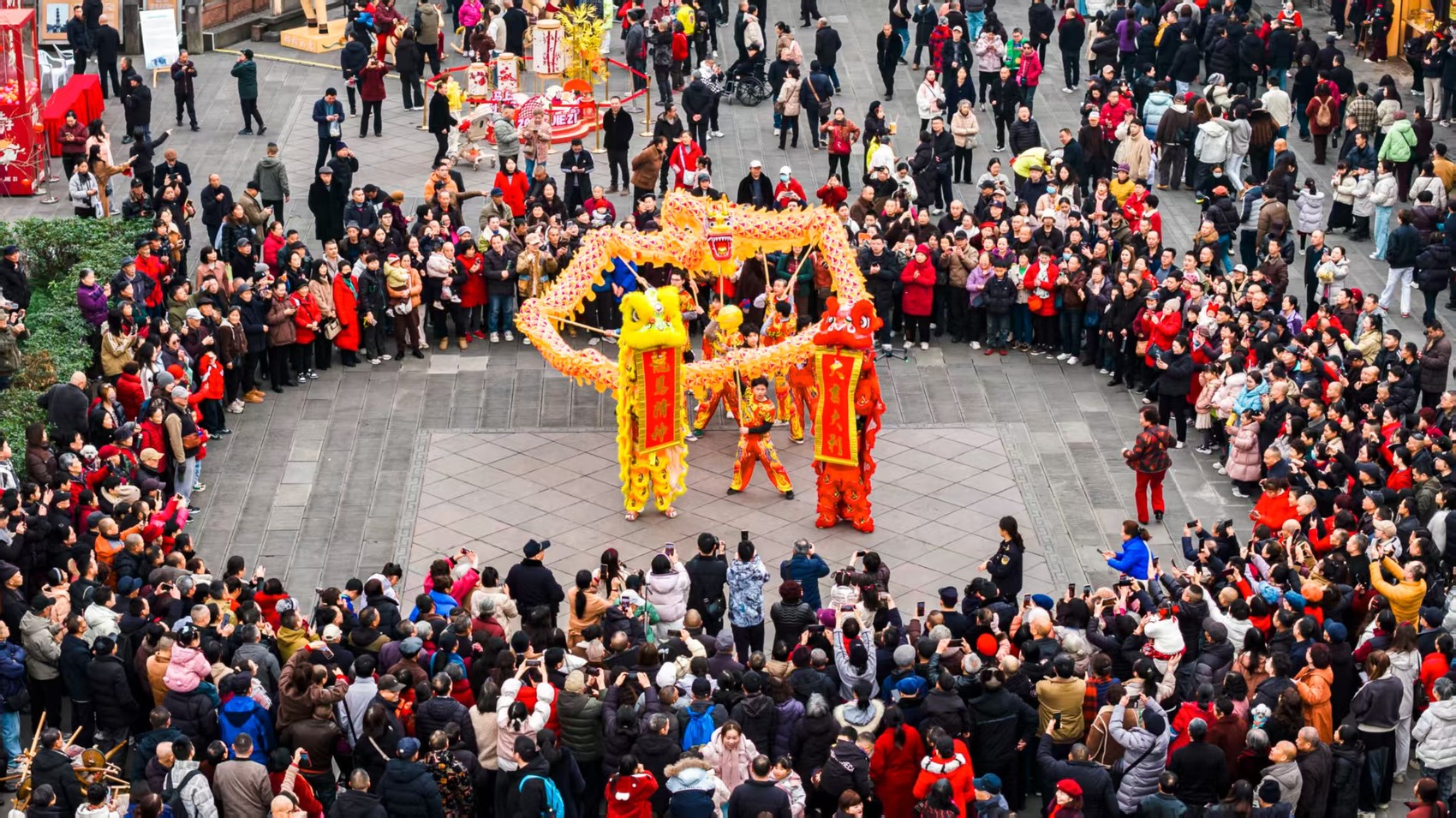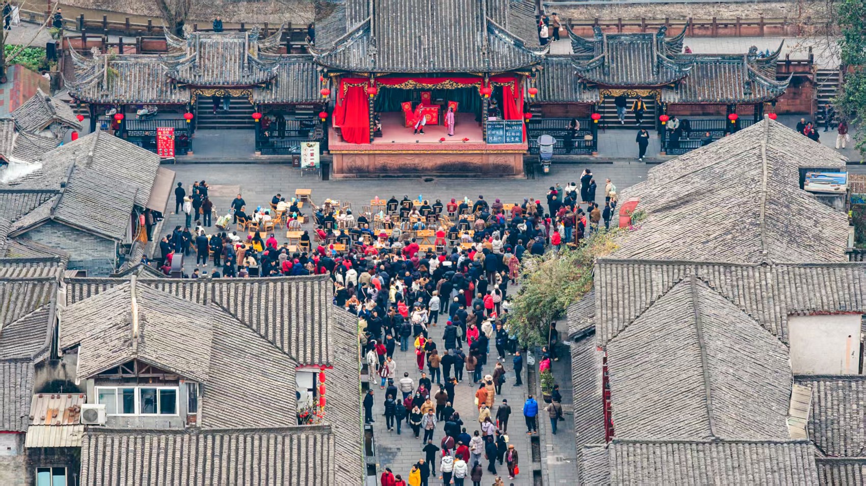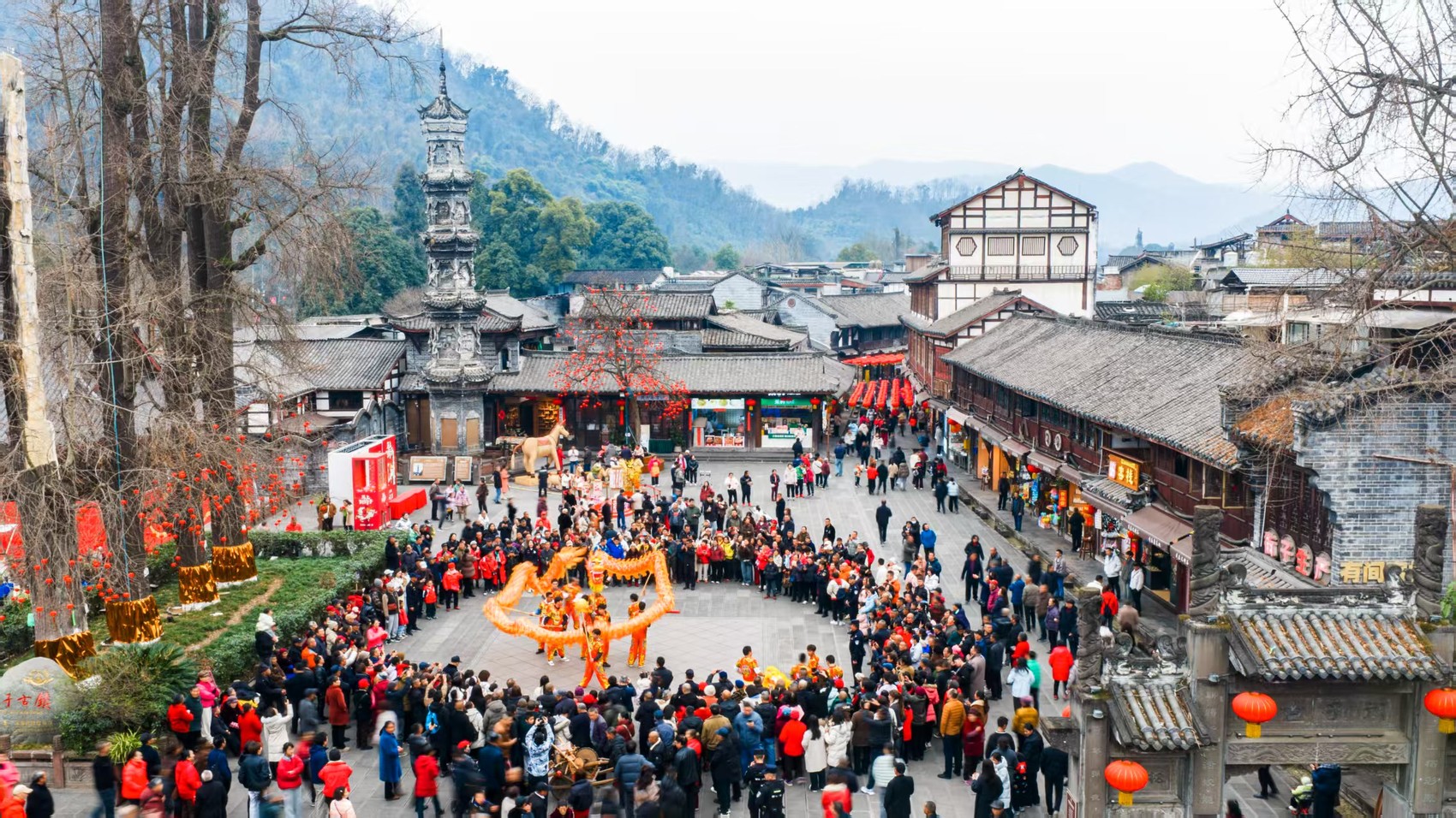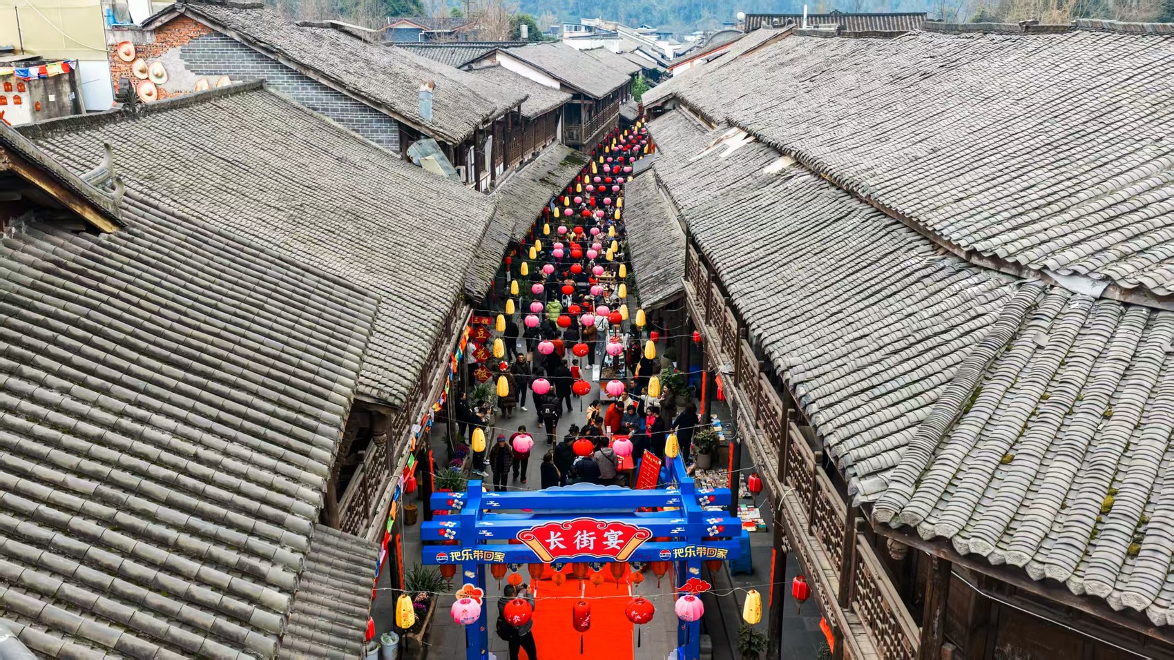 2月17日,大年初一,崇州街子古镇人流如潮,年味十足。舞龙舞狮、古戏台川剧演出、传统长街宴等活动营造出热闹喜庆的节庆氛围。