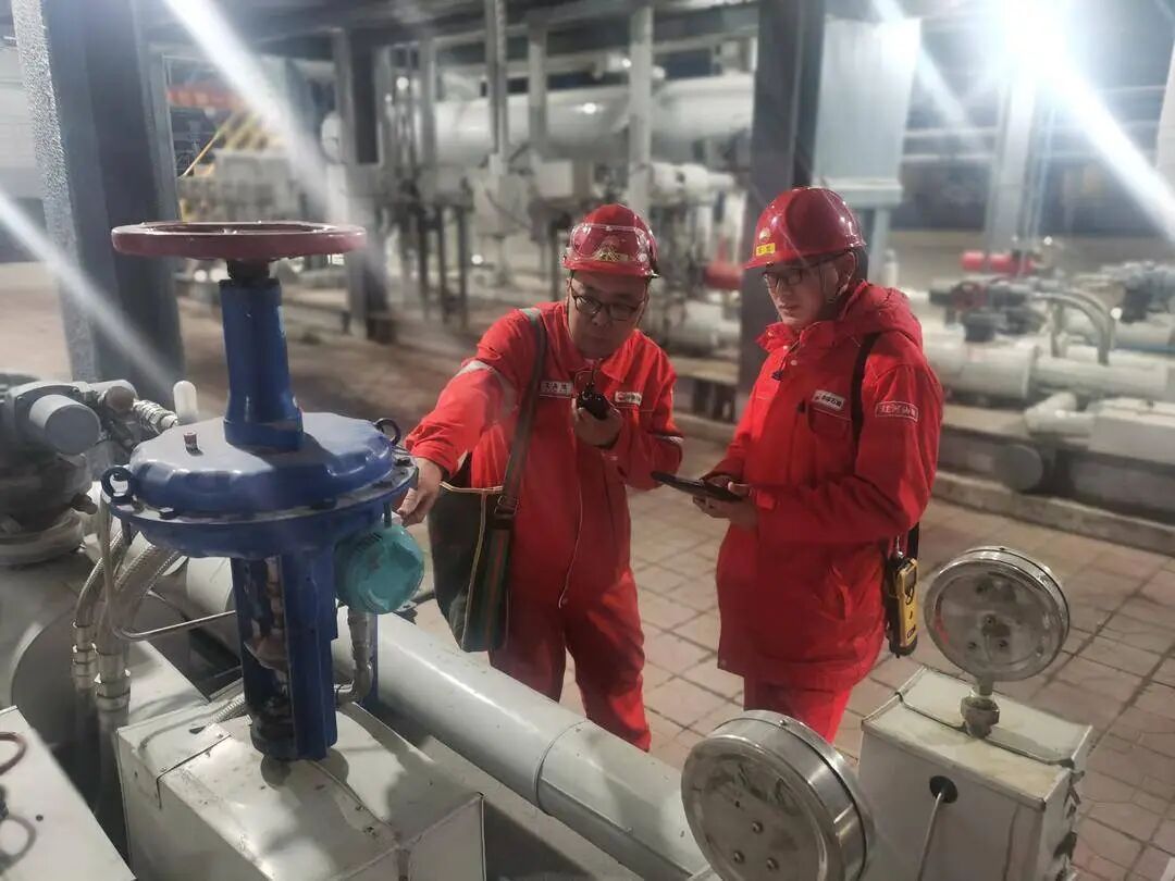 傍晚6点,夜幕完全笼罩库区,吕剑刚与班组成员吴悦带上工具包,拿上对讲机、平板电脑、激光遥测仪等装备,开始了除夕夜的第一趟巡检。阀组区、采油区、导热油区、加热炉区……他们逐点排查设备运行情况,仔细核对每一个仪表数值,全力保障库区安全。
