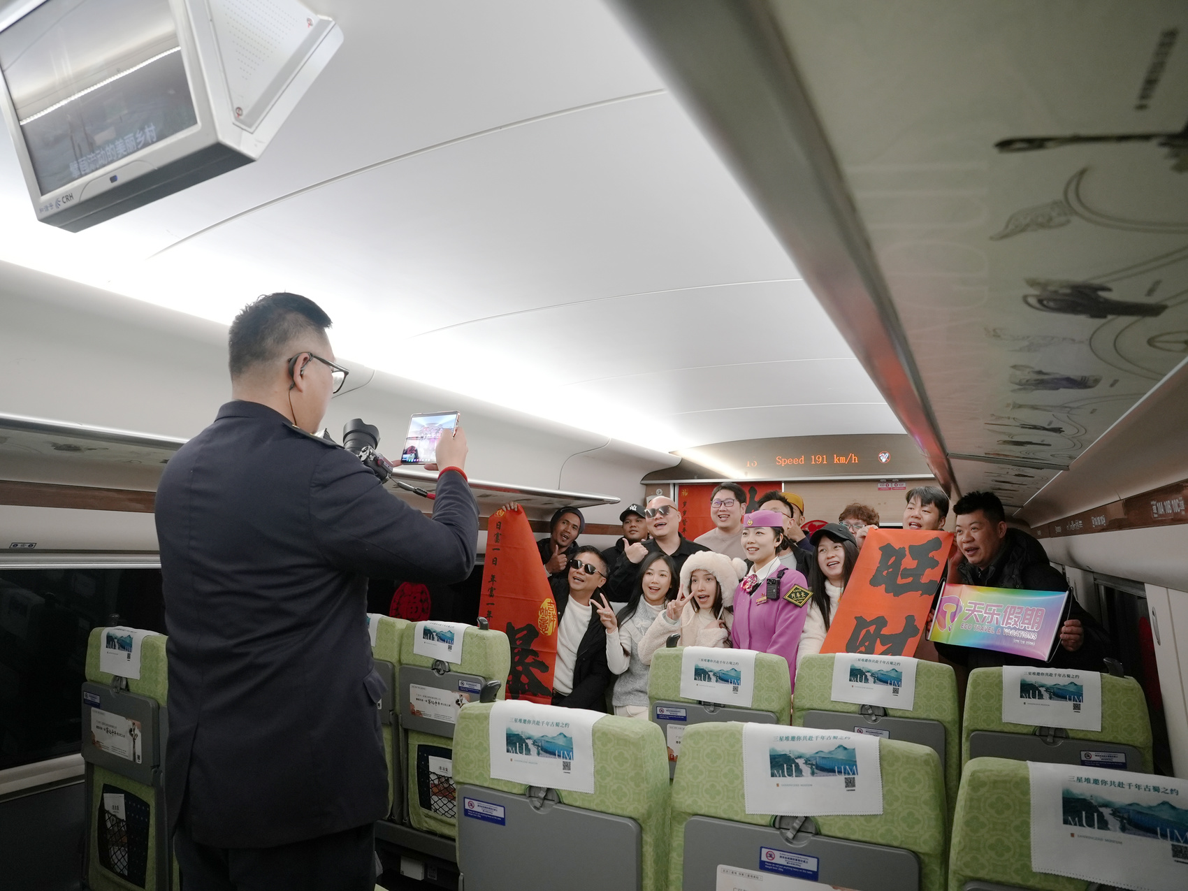 2月17日,乘务员在成都东站开往九寨黄龙站的C5782次列车上为乘客拍照。