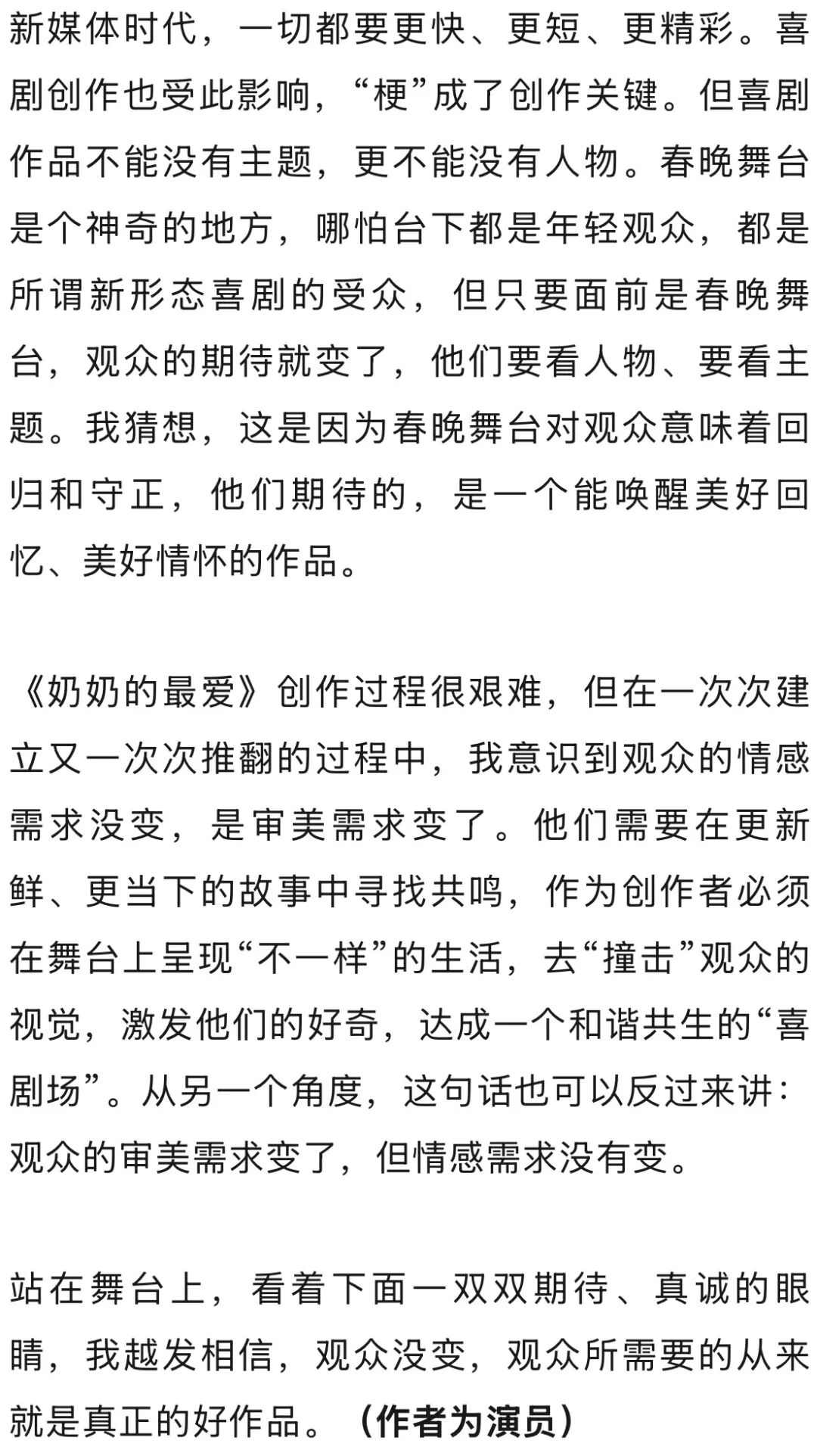 重回春晚,我发现一切似乎都没变。创作春晚小品,是我经历过的最艰难的工作,它有小品的共性:一是完整统一的事件;二是舞台上没有蒙太奇、没有时空跳跃、没有转场;三是在有限的时间里,人物关系要发生根本性的转变。除了这些,还有两个独属于春晚的要求:第一,欢乐度,要让观众开怀大笑;第二,老少咸宜。可这两条从根本上甚至是冲突的,因为现在的喜剧很难做到老少咸宜,年轻人笑的地方,老年人看不懂,老年人笑的地方,年轻人嫌太旧。给所有人带来欢乐,是春晚演员的职责,我能做的,就是拼尽全力。