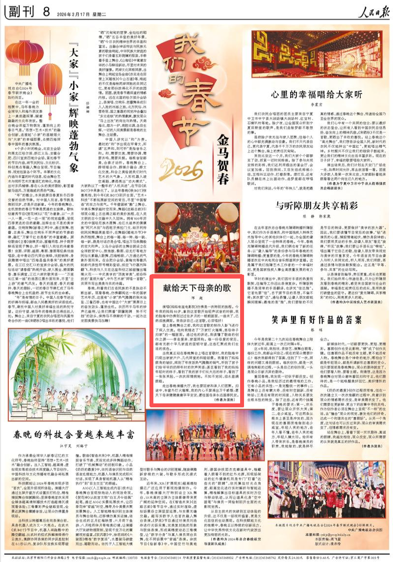 此外,《人民日报》2月17日同版刊发演员邓超署名文章《献给天下母亲的歌》。