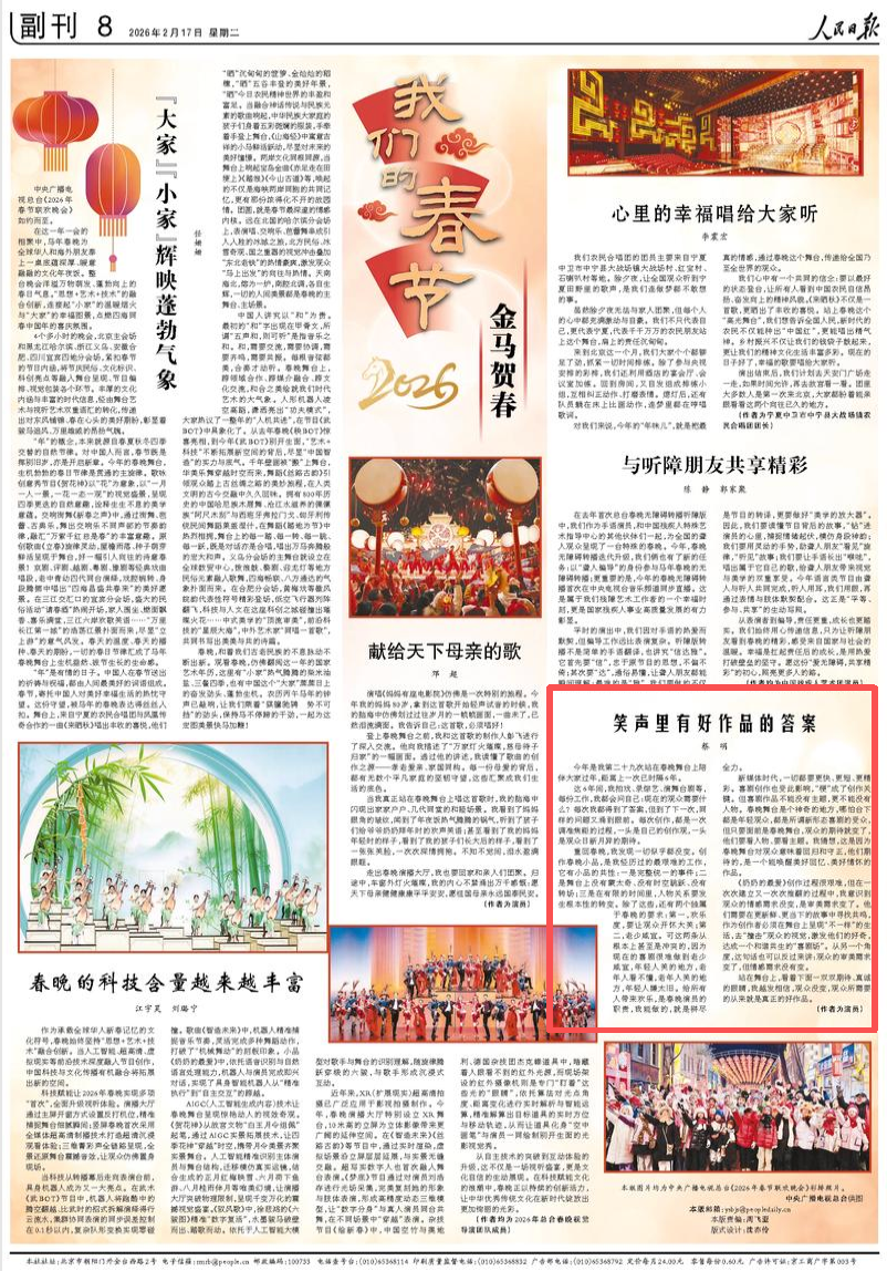 《人民日报》2月17日大年初一刊发演员蔡明署名文章《笑声里有好作品的答案》。