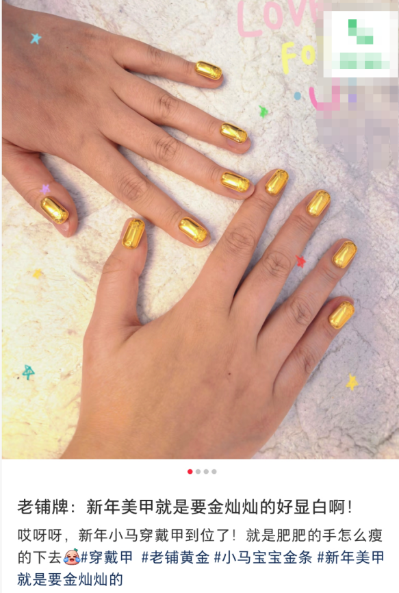 周大福等头部品牌的小件金饰,甚至老铺黄金的金条都成了美甲店的“高端原料”,有消费者表示,愿意花数千元、上万元打造“黄金甲”。