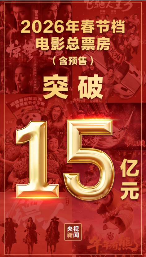 据网络平台数据,2026年春节档电影总票房(含预售)破15亿!《飞驰人生3》《惊蛰无声》《熊出没·年年有熊》位列前三。