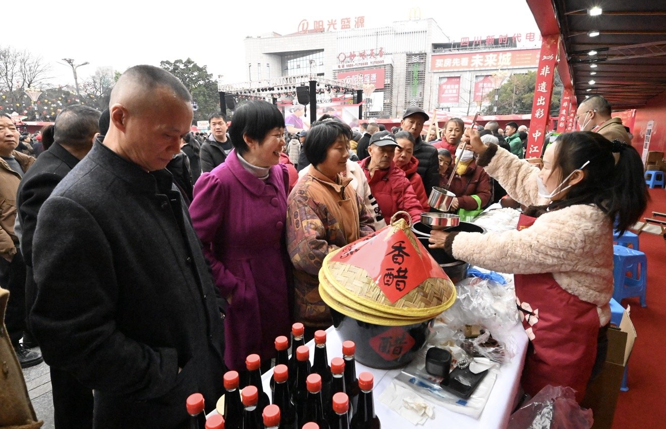 开幕式后,核心板块“焕彩非遗‘忆’条街”正式开放。街区被划分为沉浸式表演、互动体验、视听观赏、非遗美食四大区域,形成了一个完整的“展演消”闭环。这边厢,金钱板敲得清脆,阳平菜刀的锻造声铿锵有力;那边厢,棕编、竹编、剪纸的摊位前围满了跃跃欲试的体验者。舌尖上的诱惑同样不容错过——广福松花皮蛋蛋白晶莹剔透,八宝油糕甜而不腻,刚出锅的普兴凉粉淋上红油,香气窜得老远。