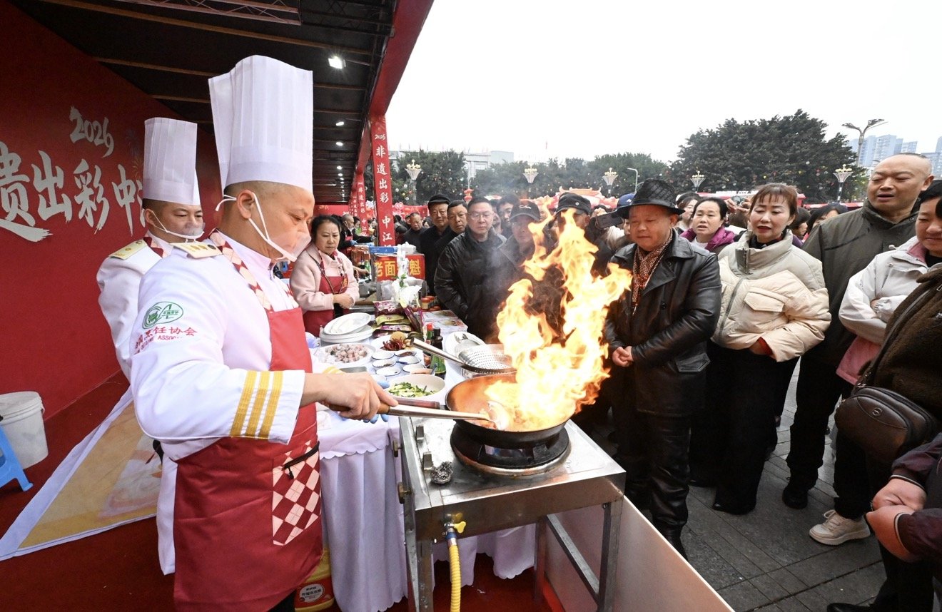 2月17日,农历正月初一,中江县公园广场上锣鼓喧天,人潮涌动。2026年“非遗出彩 中江记忆”新春非遗系列活动在此拉开帷幕。这场以非遗为内核的新春聚会,通过“展、演、赛、玩、购”的多元融合,将传统年俗与现代生活巧妙链接,为当地群众端出了一道可触可感的文化大餐。