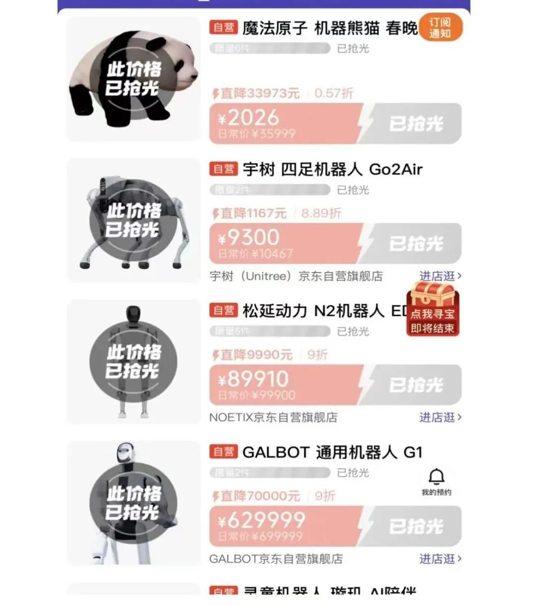 在除夕当晚10点,有平台上架了包括“春晚同款”机器人在内的多款机器人。在活动上线几分钟内,包括魔法原子、宇树科技、松延动力等品牌的机器人即被抢购一空。其中,两台价值近63万元的GALBOT通用机器人G1,同样瞬间被抢购一空。