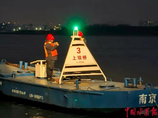 18时01分,船舶精准停靠至上坝桥,工作人员穿戴好防护装备,小心翼翼地登上浮标,开始更换标名牌。江面浪涛起伏,浮标不停晃动,两名工作人员站稳身形,开始抓住扶手,配合着拧动螺丝。“标名牌是航标的‘身份证’,必须清晰、规范,过往船舶才能准确识别航道信息,哪怕是一点模糊,都可能影响航行安全。”。