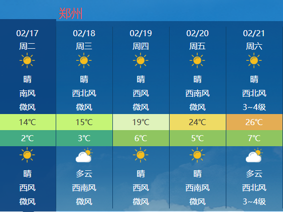 新年开场,晴朗上线,策马扬鞭式的大回暖也将开启!今天至初五我省将迎升温高峰,尤其是20-21日,大部地区最高气温直冲20℃+,21日是近期最高气温的顶点,比如郑州、安阳、开封等地市将达到或超过25℃,春天般的暖意扑面而来。最低气温也逐渐回升,除了西部和北部,大部地区预计升至5-7℃之间。