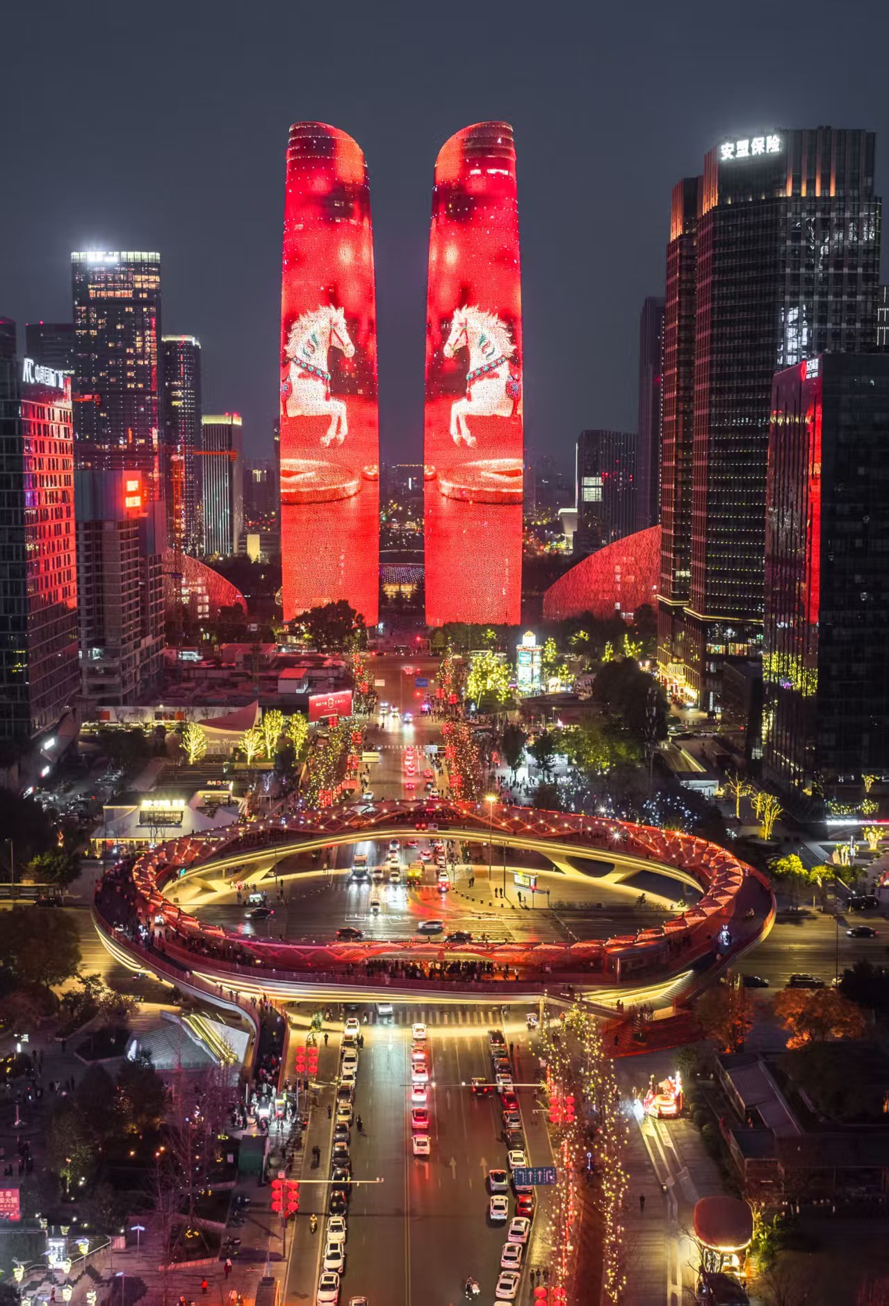 值得注意的是,除了除夕,初一至初七的19:00-24:00(三场整点灯光秀时间为20:00、21:00、22:00),天府双塔都会呈现巨型春联、我爱成都、云看大熊猫等新春传统元素与数字创意光影相融合的主题灯光秀,向在蓉市民游客花式拜年。