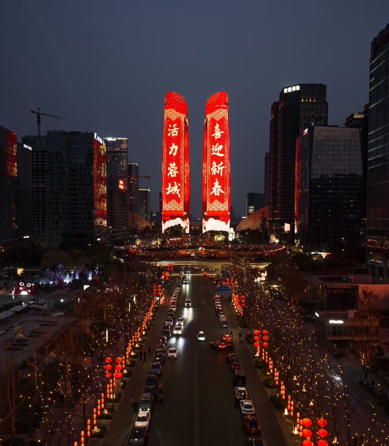 18时,“新春启幕・喜乐开篇”天府双塔马年春节限定光影作品亮相,其以中国传统节庆文化为基础,将春联、十二生肖等元素与现代新春场景相结合,呈现于52000平方米的巨幕上,与市民游客共同迎接新年的到来。