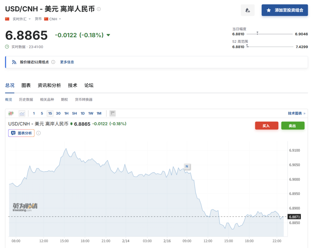 2月16日深夜,离岸人民币汇率继续保持强势,涨超100点,盘中升破6.89。