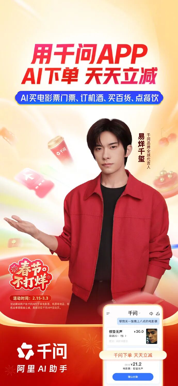 继此前“免单卡”引发关注后,2月17日,千问APP今日再推新活动:没有拿到免单卡的用户也不用等,即日起至3月3日,通过千问APP使用AI下单,购买电影票、门票、机票酒店、百货商品及餐饮,均可享受天天首单必减。