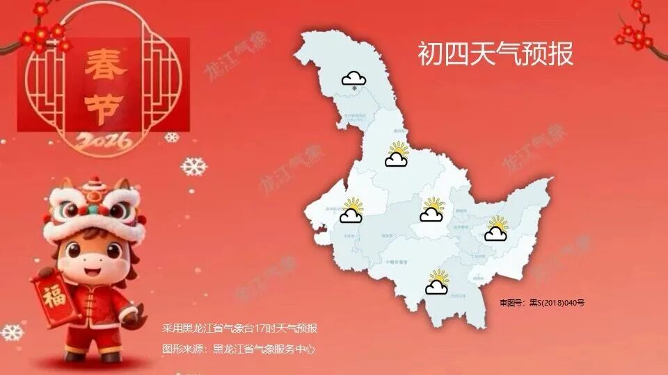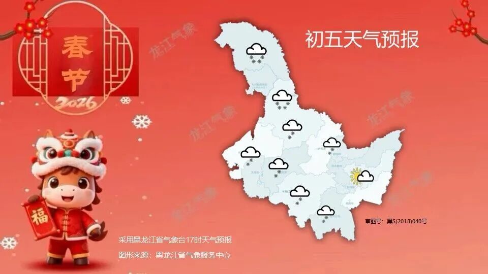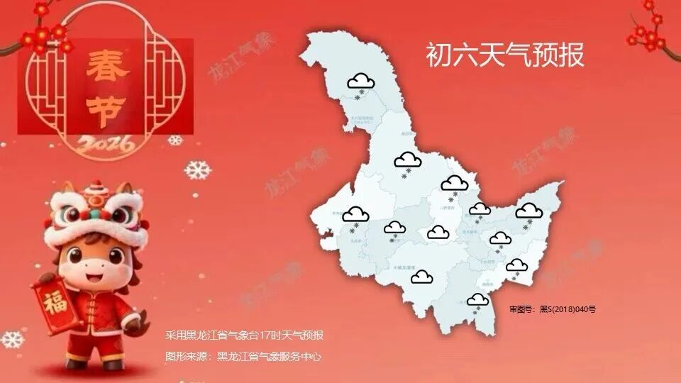 22日(初六):大兴安岭、黑河、伊春北部、齐齐哈尔、大庆、绥化、鹤岗、佳木斯、双鸭山、鸡西东部、牡丹江东部阴有小雪,其中大兴安岭北部、双鸭山东部、鸡西东部局地有中雪,其它地区多云。