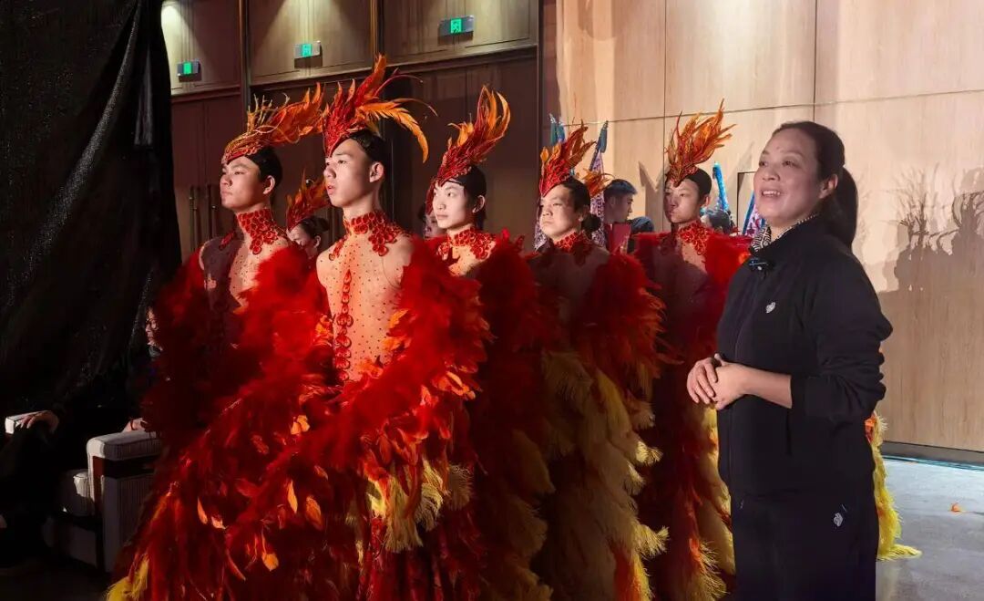 更大的问题是视线被挡。为保证节目呈现效果,定制的凤凰羽毛重量达5斤多,且面积庞大,背在身上会遮住大半个身体。舞动起来时,部分站位的孩子常看不见侧面的指挥手势。他们只能靠彼此互相拍打肩膀来提醒变队形,并加大呼吸幅度,用气息的浮动传递节奏。
