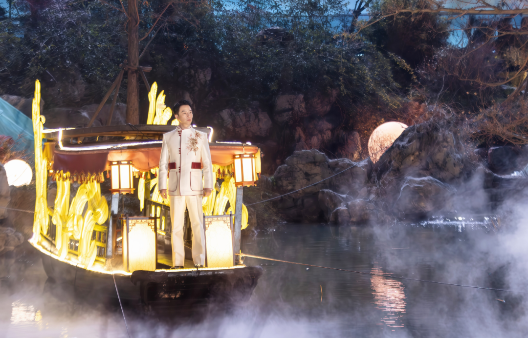 据主创团队介绍,安徽园是徽派园林的精髓,亭台楼阁、小桥流水,空间很精致但也相对狭窄,这对拍摄来说是个挑战——所以我们特别设计了一艘船,让演员黄轩立于小船之上,欣赏这番山水美景,最终由衷地感叹:“古今融于此,江淮合于斯。”观众在看节目时,相信也会感受到自己仿佛置身于一幅流动的徽派山水画卷中。