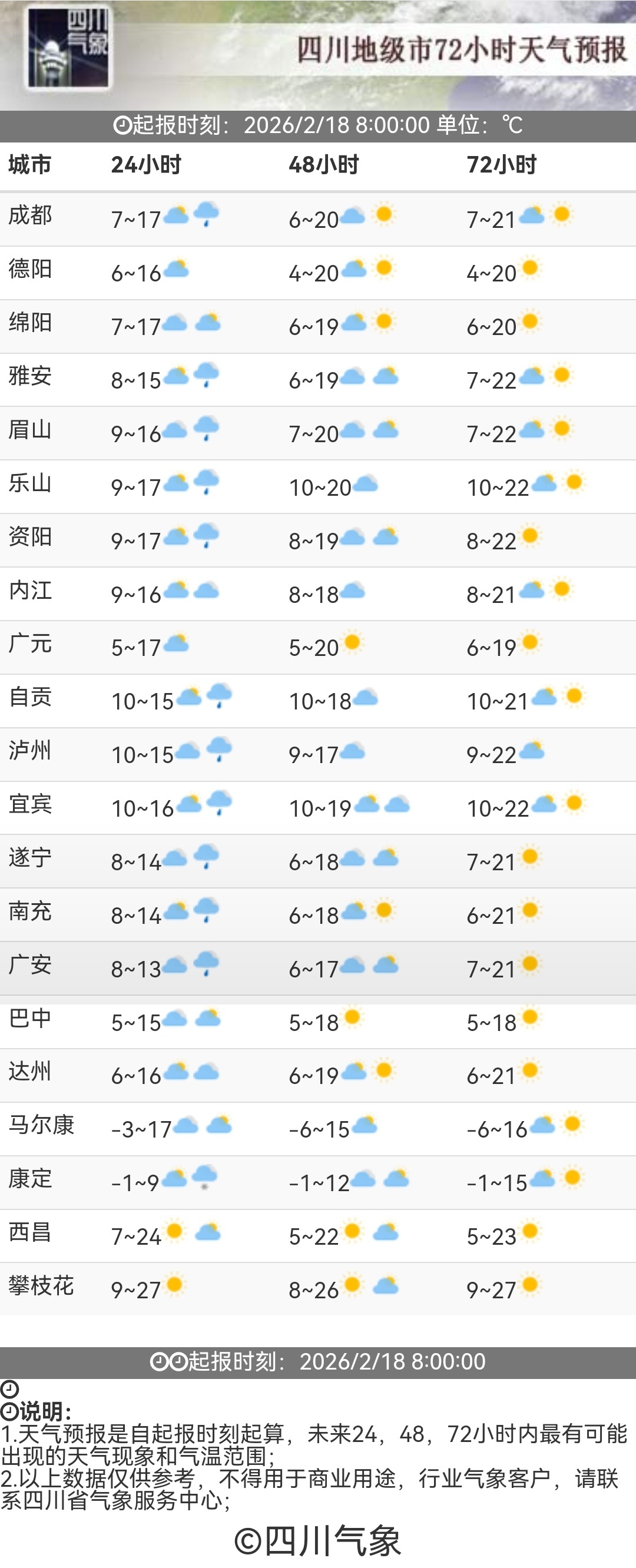 据四川省气象台18日早间最新预报,今天白天,盆地大部阴天间多云,西部、南部山区有分散小雨或雨夹雪;今天晚上,盆地北部多云间阴,其余地方阴天间多云有小雨,高海拔山区有雨夹雪或小雪。19日盆地大部多云间阴,西部、南部山区有分散小雨或雨夹雪。20日盆地大部晴间多云。在此期间,各城市气温将普遍回升到20℃及以上。