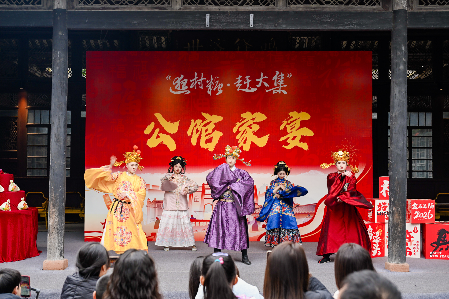 走出公馆,安仁古镇的街头巷尾同样热闹纷呈。集章打卡、主题巡游、舞蹈快闪等互动体验轮番上演,游客在套圈投壶间集福纳吉,在街头巷尾与星君共舞同乐。金狮贺岁、篝火狂欢点燃不夜之镇,坝坝电影唤醒旧时记忆。而“逛村糖·赶大集”主题市集汇聚地方美食与非遗风物,游客可在地道的川西年节烟火气中一站式寻味。