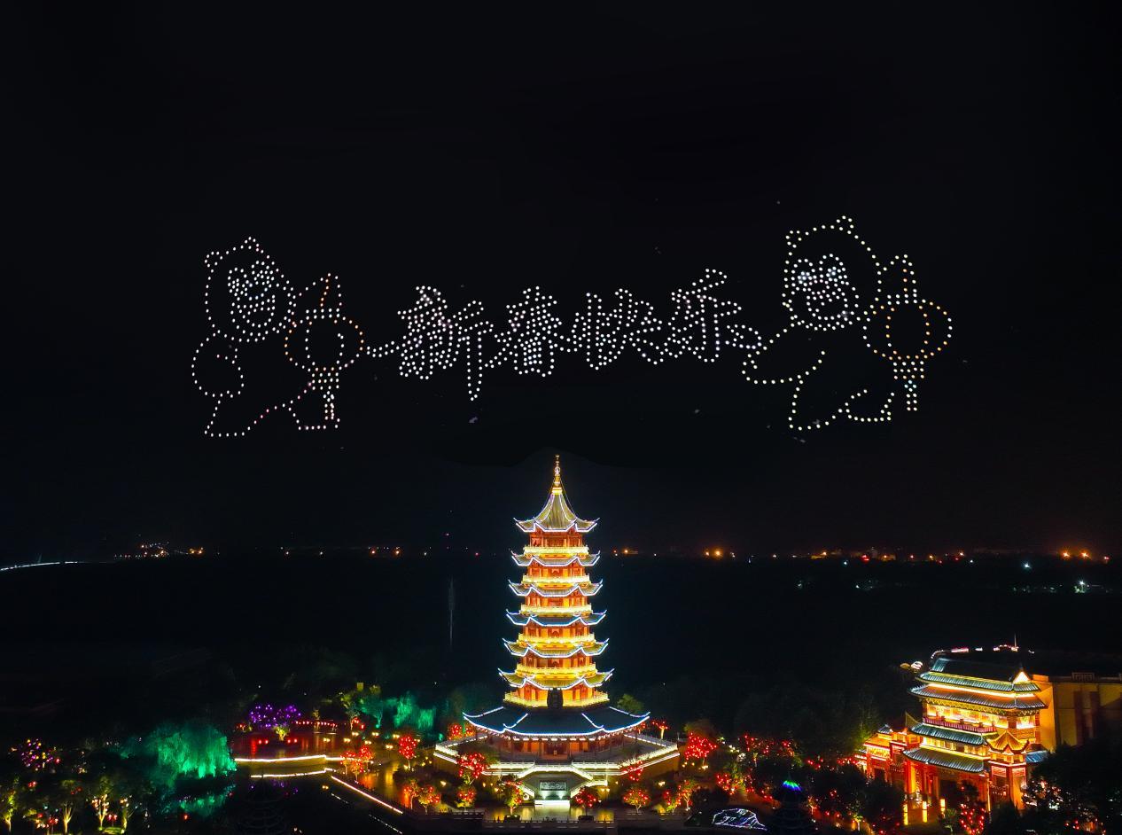 当夜幕降临,节庆广场上篝火燃起,游客们手拉手围火而舞,欢声笑语驱散了冬夜的寒意。随后,千架无人机腾空而起,以夜空为幕、以光影为笔,变幻出“福”“春”等吉祥图案,将科技与艺术完美融合,传递着对新春的美好祝愿。紧接着,璀璨烟花划破长空,流光溢彩间将节日气氛推向高潮,游客们纷纷举起手机,记录下这浪漫而震撼的时刻。