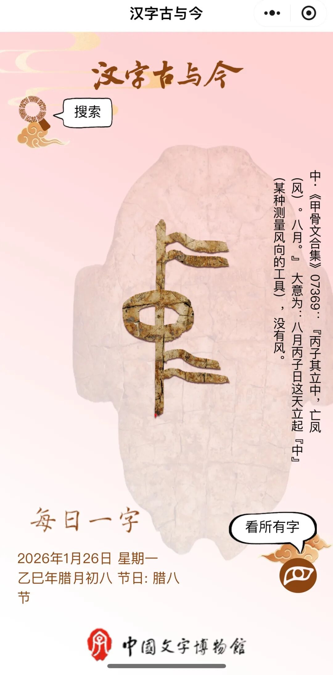 方寸之间,三千多年前的甲骨文字在手机屏幕上苏醒,当你的指尖划过屏幕,甲骨文到现代汉字的演变脉络便浮现于眼前。1月26日,中国文字博物馆推出的“汉字古与今”微信小程序正式上线,这不仅是一次中华优秀语言文化数字化传播的新实践,更是文物保护与甲骨文学术研究领域社会普及推广的新实践。它以数字技术为桥梁,让深藏于“象牙塔”中的甲骨文字走出博物馆,让古文字研究的学术成果惠及大众,为文物数字化建设、甲骨文系统性保护与学术研究开辟了新路径。