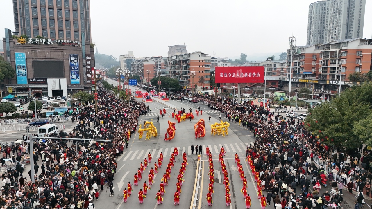 锣鼓声震彻云霄,金龙雄狮昂首腾跃,欢笑声、喝彩声传遍广安邻水的大街小巷。2月17日大年初一上午9时,一场主题为“瑞马迎春·与邻相约”的非遗民俗拜大年巡游活动热闹举行,一公里长的展演队伍载着乡愁与欢喜,踏春而行、走进群众,让数万名邻水市民在沉浸式体验中,解锁马年新春充满活力的年味。