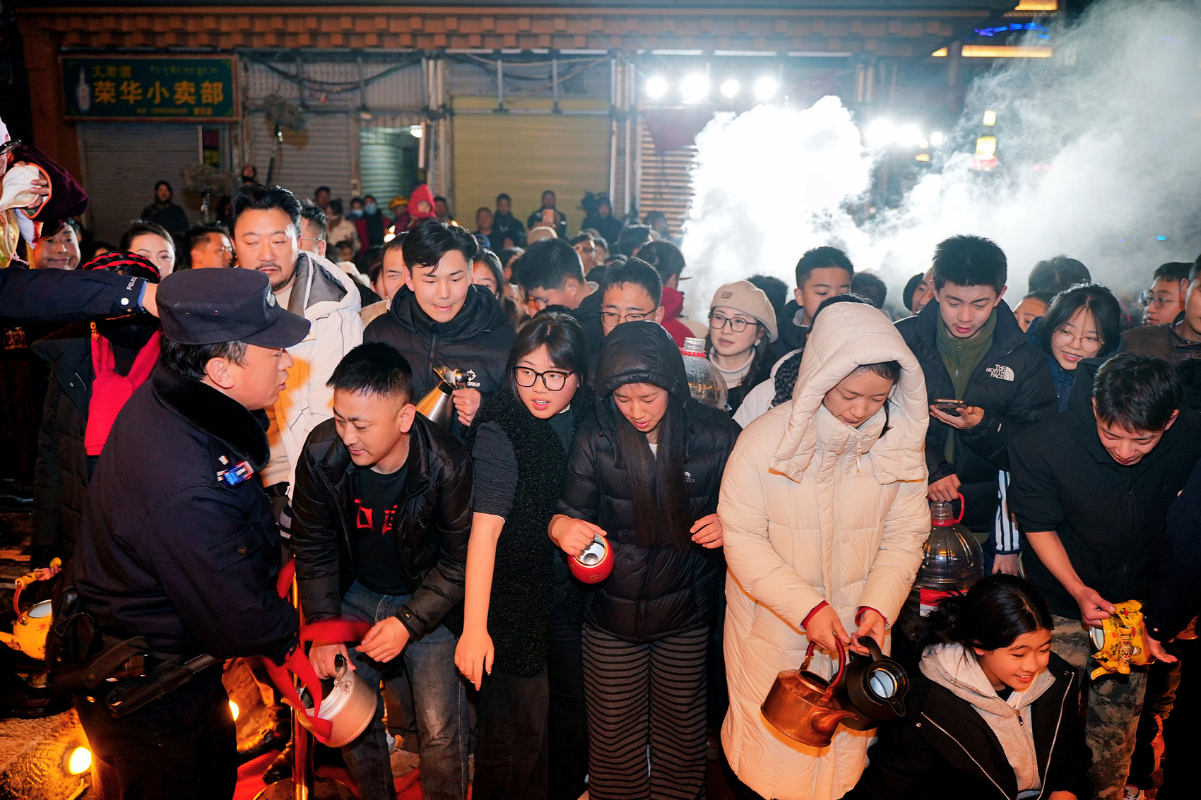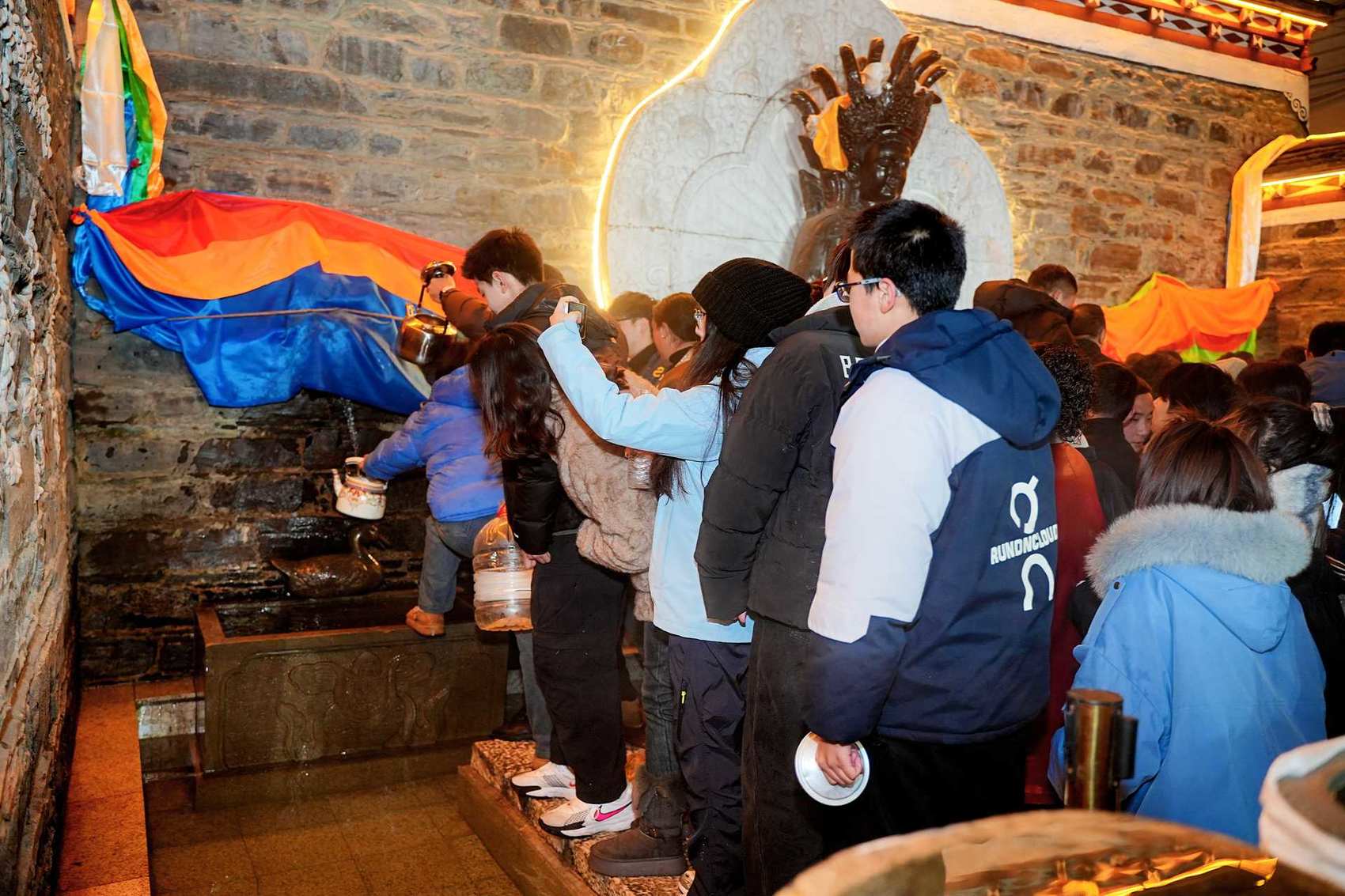 零点一到,泉边瞬间沸腾。人们欢呼着涌向泉眼,将手中的器皿探入水中,舀起新年的第一桶泉水。按照当地习俗,抢到的“头水”要用来煮新年的第一顿早餐。