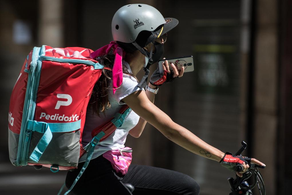 这是2021年3月27日拍摄的智利首都圣地亚哥街头的一位送餐员。新华社发(豪尔赫·比列加斯摄)