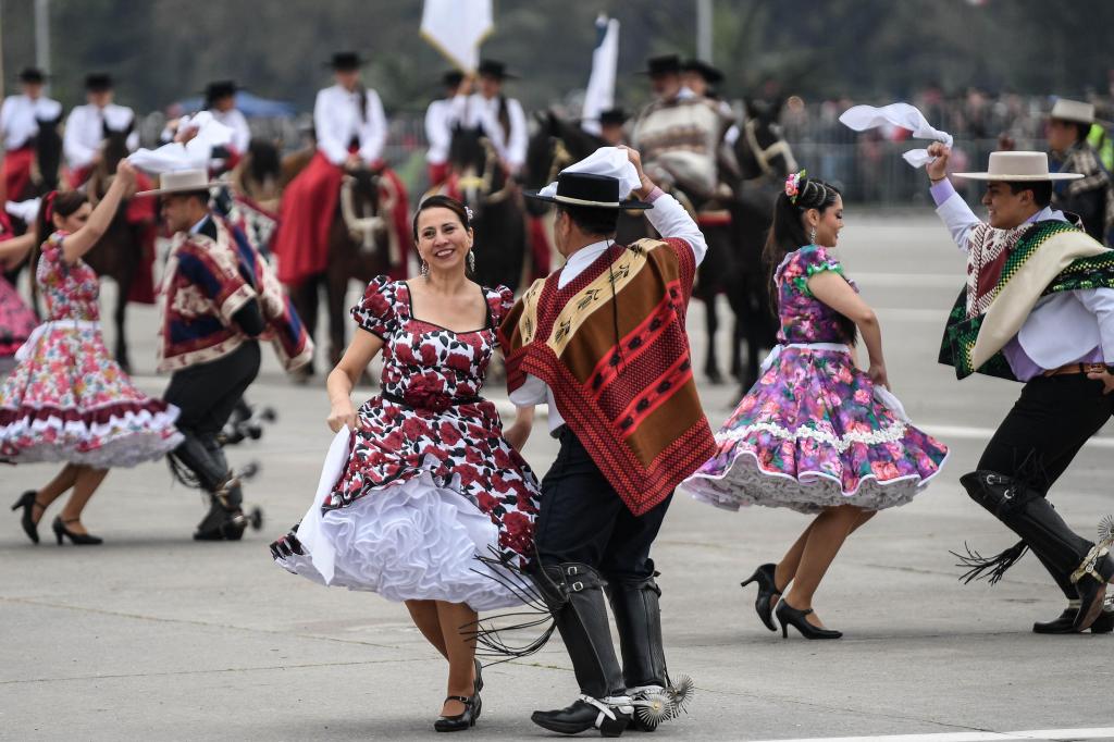 2023年9月19日,在智利首都圣地亚哥,身着民族服装的舞者在智利陆军节阅兵式期间跳起传统舞蹈奎卡。新华社发(豪尔赫·比列加斯摄)