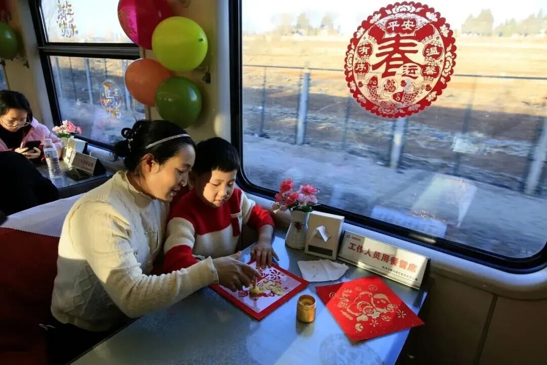 2月2日,大连至满洲里的列车上,母女正在感受拓印福字体验。刘慎库 摄