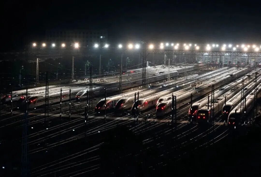 经过一天的奔波,一列列复兴号动车组列车有序列队,准备进入广州南动车运用所。
