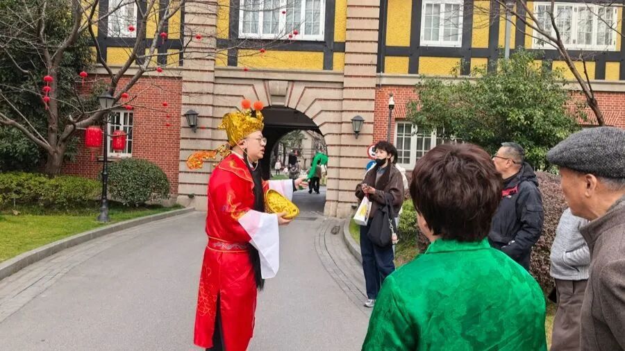 在瑞金宾馆,记者还体验了一场别开生面的“财神导览”:工作人员装扮成喜庆的财神,手持金元宝与如意,带领住客穿行于名人公馆、历史别墅之间,在送上新春祝福的同时,也将建筑背后的历史故事娓娓道来。这种将传统财神形象与城市历史文脉讲解相结合的创新方式,让年俗体验更具知识性和趣味性,吸引了不少住客参与。