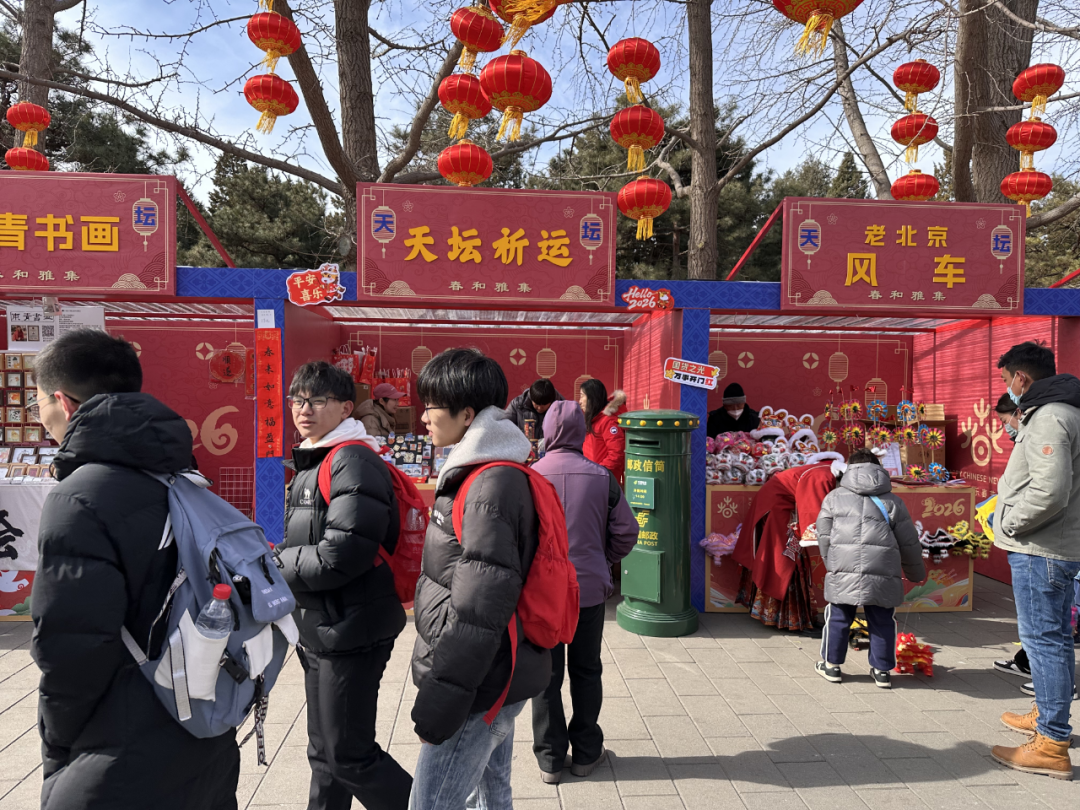 天坛公园“春和雅集”文化市集与“天坛创意”文创市集双线联动,以非遗手作与国潮文创为核心,为游客打造沉浸式新春消费新场景。限量5000张的祈年殿造型明信片融合工笔重彩与水彩云纹,一上市便成为打卡爆款。“福”字包挂、“马载鸿福”冰箱贴等新品将祈年殿色彩与生肖文化巧妙结合,让祈福融入日常。奥运主题邮局临时服务点,购物满额提供免费生肖邮票与寄信服务,游客写下期许投递邮筒,让祝福飞向远方。来自天津的游客李女士手持明信片与祈年殿同框打卡:“既能亲手体验非遗技艺,又能带走有文化底蕴的国潮好物,这样的年味特别有意义。”