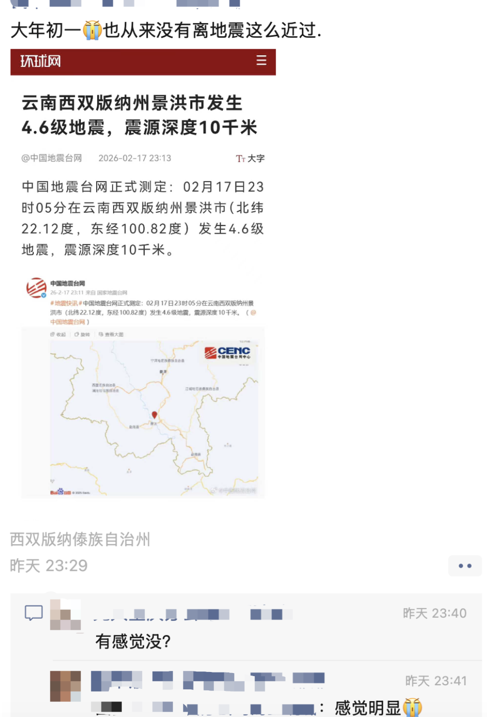 “大年初一,从来没有离地震这么近过。”2月17日晚,重庆市民张女士发朋友圈称,自己在云南西双版纳景洪市旅游时突遇地震,“床铺连带地板明显晃动,等反应过来后赶紧下楼。”在社交平台相关地震信息也引发关注,不少博主发帖感叹:“大年初一遇上地震,心里还是发怵”“希望大家平安。”也有当地网友在评论区表示,景洪地处地震带,“有震感并不罕见。”
