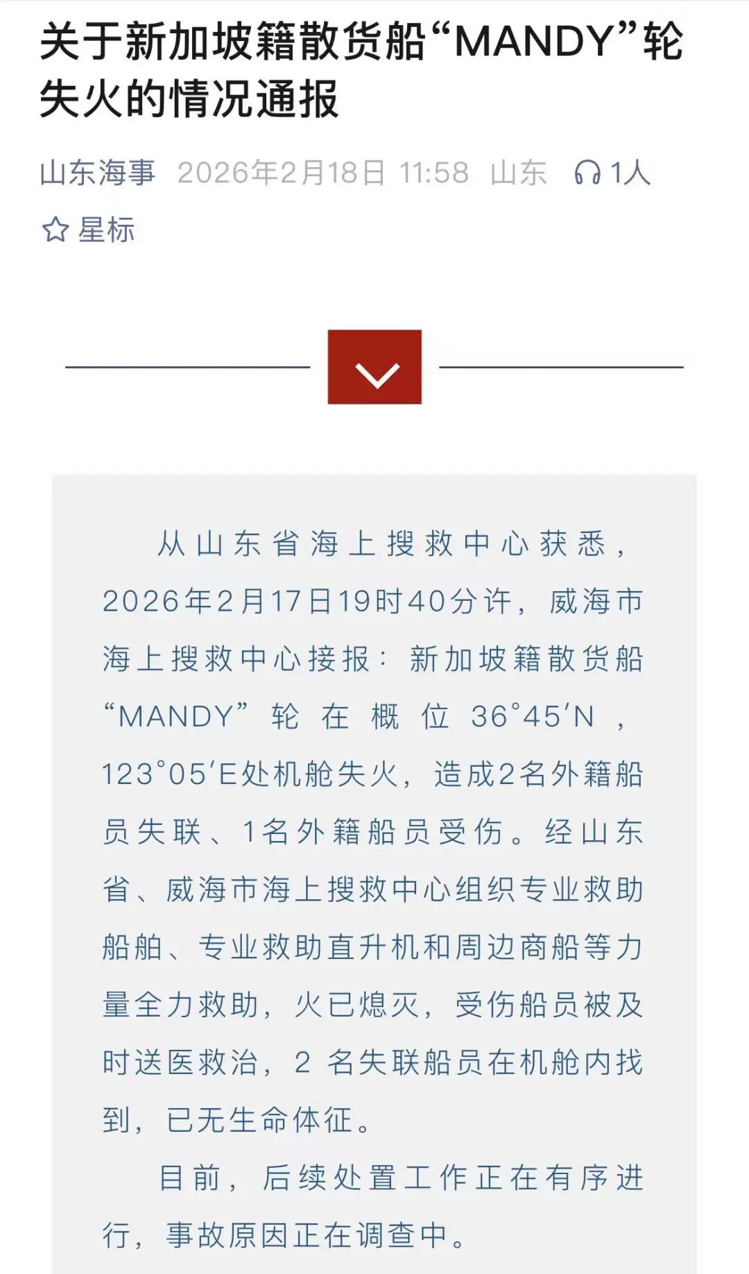 据山东省海上搜救中心,2026年2月17日19时40分许,威海市海上搜救中心接报:新加坡籍散货船“MANDY”轮在概位36°45′N,123°05′E处机舱失火,造成2名外籍船员失联、1名外籍船员受伤。经山东省、威海市海上搜救中心组织专业救助船舶、专业救助直升机和周边商船等力量全力救助,火已熄灭,受伤船员被及时送医救治,2 名失联船员在机舱内找到,已无生命体征。目前,后续处置工作正在有序进行,事故原因正在调查中。