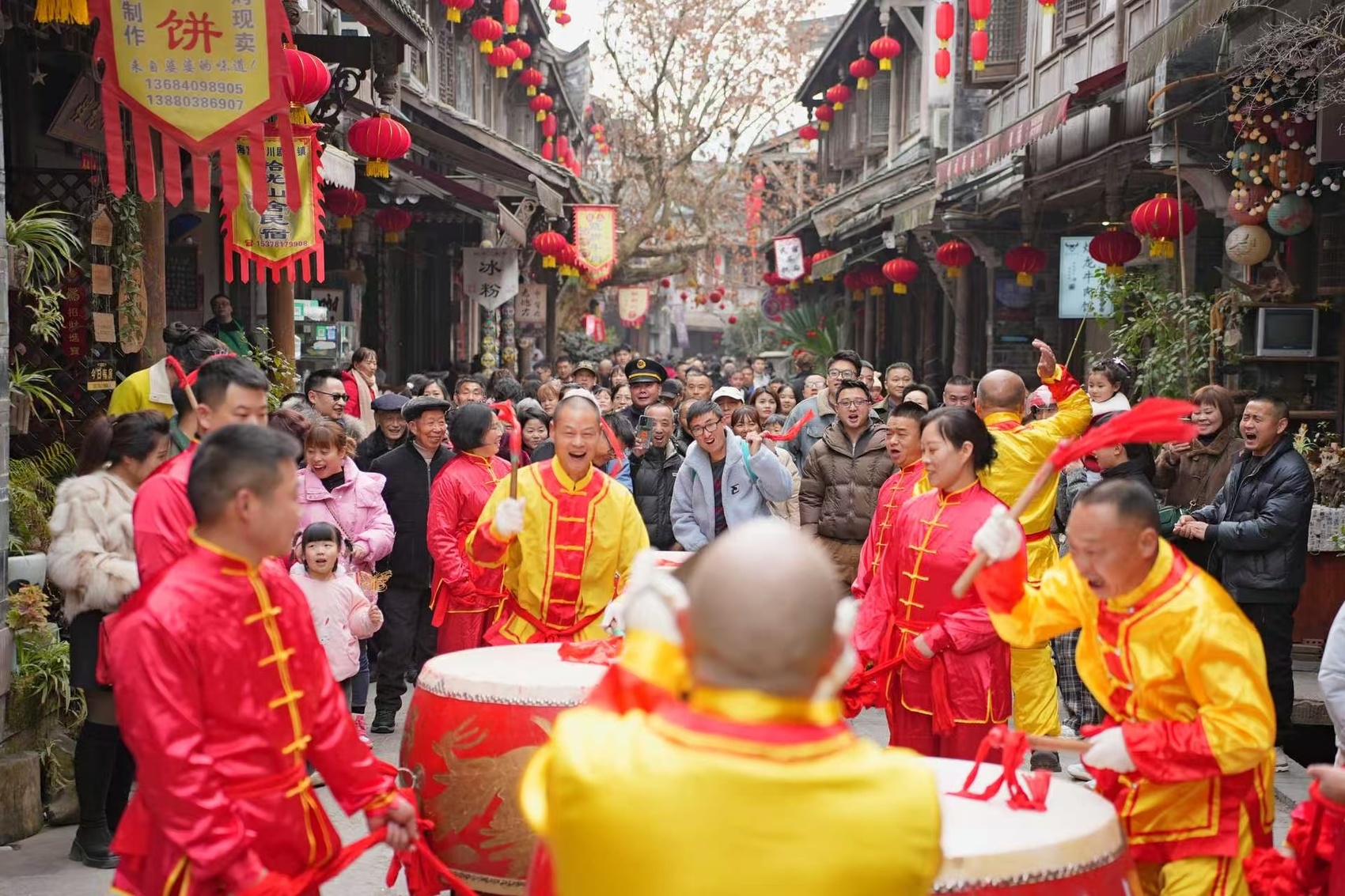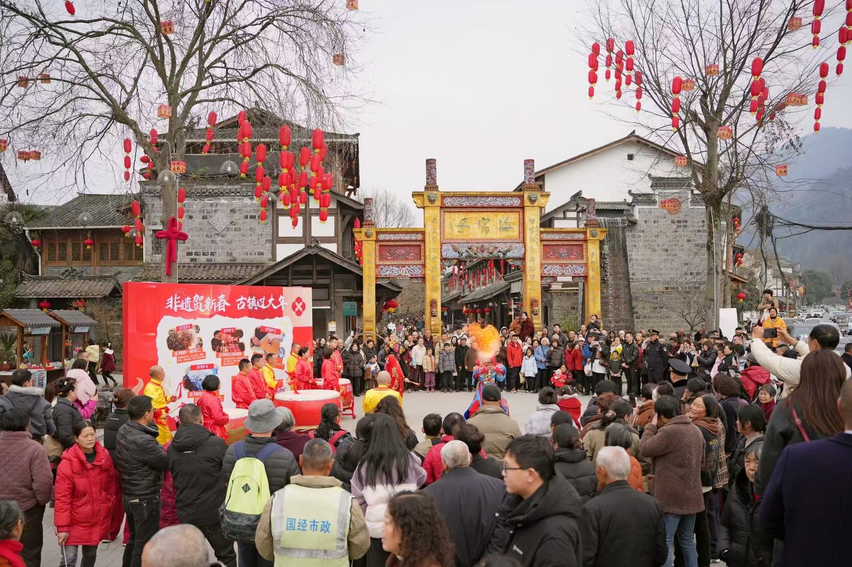 大年初一,通济镇齐聚40余位表演者,开展了4场丰富多彩的传统民俗和非遗活动,其中有通济镇君山村相传起源于古蜀国的鼓乐仪式——君山大鼓,也有国家级的传统非遗——打铁花,还有舞龙、舞狮、踩高跷、变脸吐火等节目轮番登场。当天,通济镇共接待游客超过5万人次,其中海窝子古镇接待约2.5万人次,超过1400名游客前往狮子山登高望远。