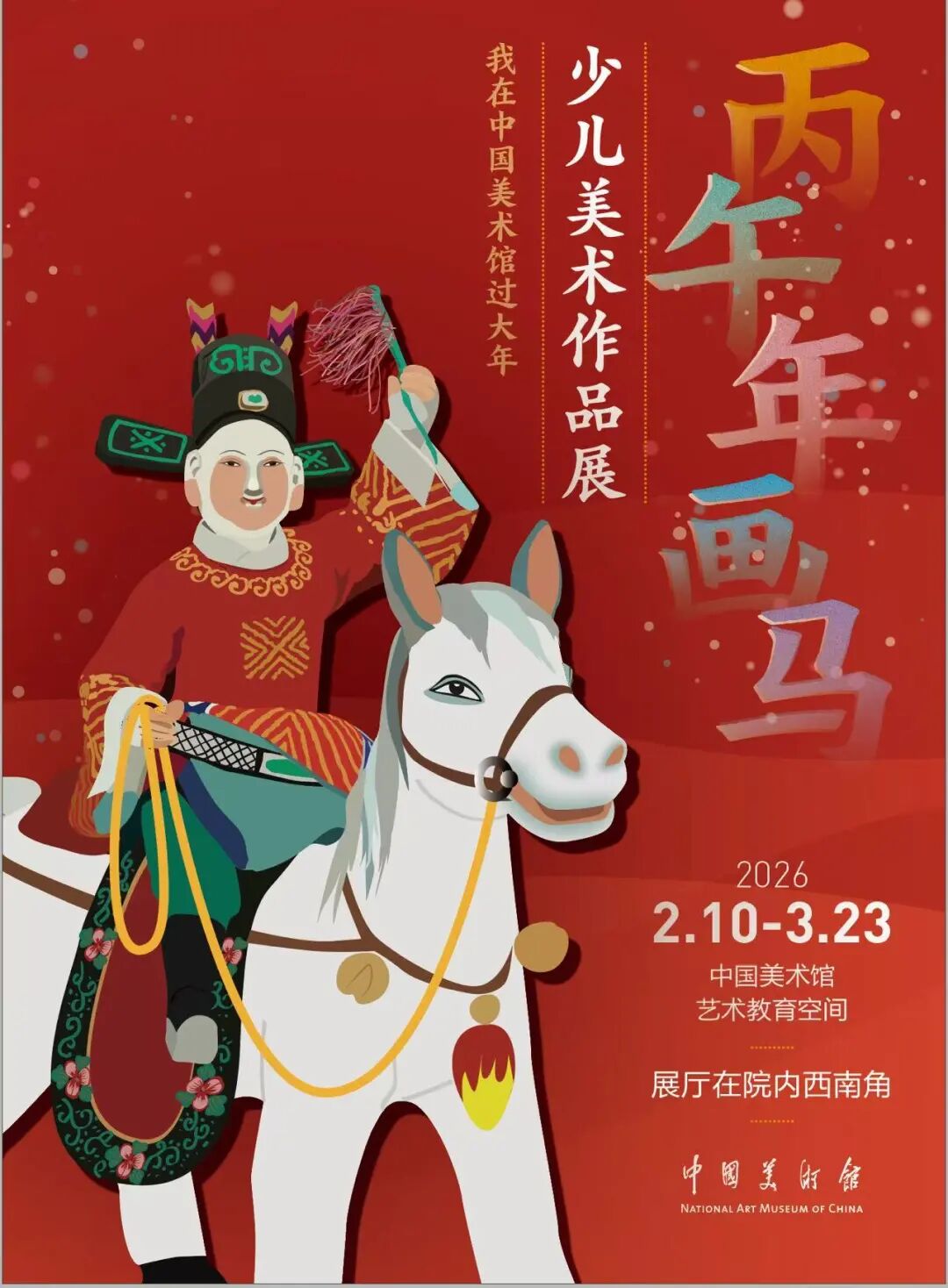 今年是农历丙午马年。展览邀请全国少年儿童以画笔表现骏马形象。在借鉴民间吉祥元素的基础上,展现出少年儿童特有的想象力与表达方式,既有对“龙马精神”的生动诠释,也流露出成长中的志趣与活力。