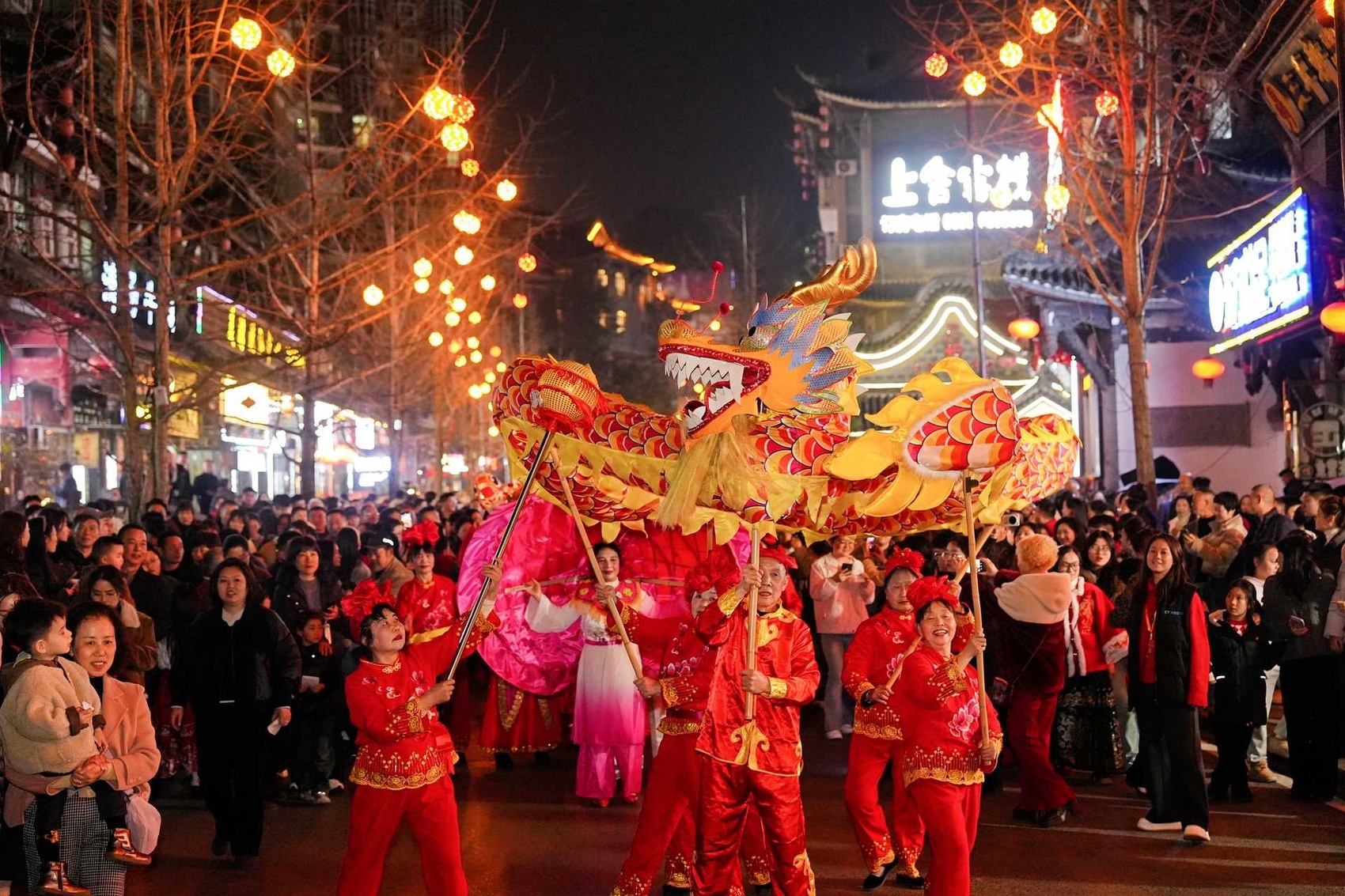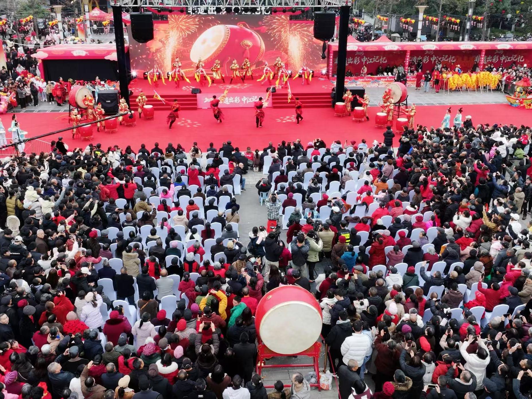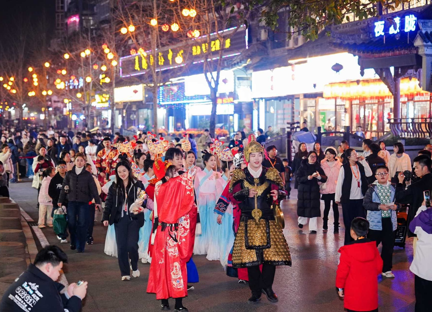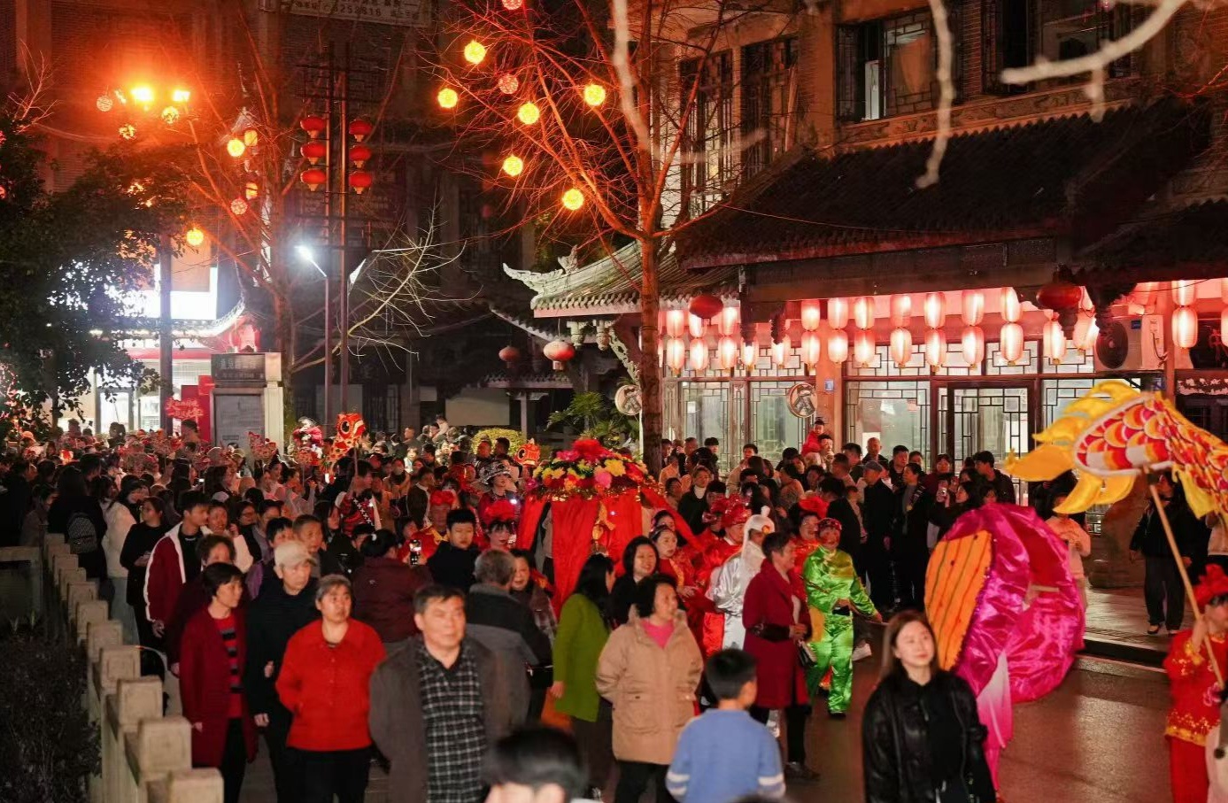 “福满鱼凫”主题巡游率先点燃节日激情,金龙昂首摆尾、雄狮腾跃翻滚,身着传统服饰的表演者手举鱼灯、挥舞莲枪,身姿翩跹间与古街飞檐斗拱、小桥流水的景致完美相融。锣鼓铿锵,欢声阵阵,既点燃了现场游客的热情,更将马年的福气与喜气,传递至古街的每一个角落。