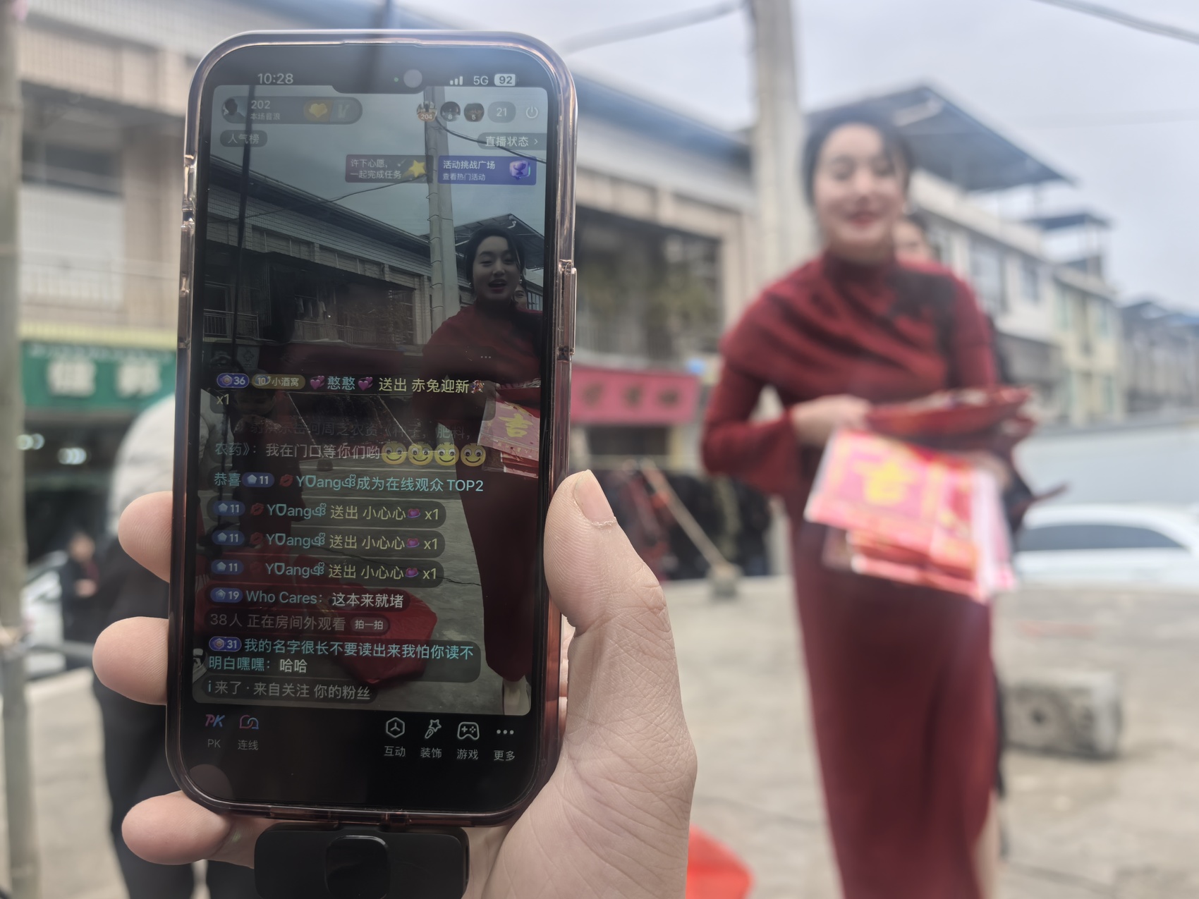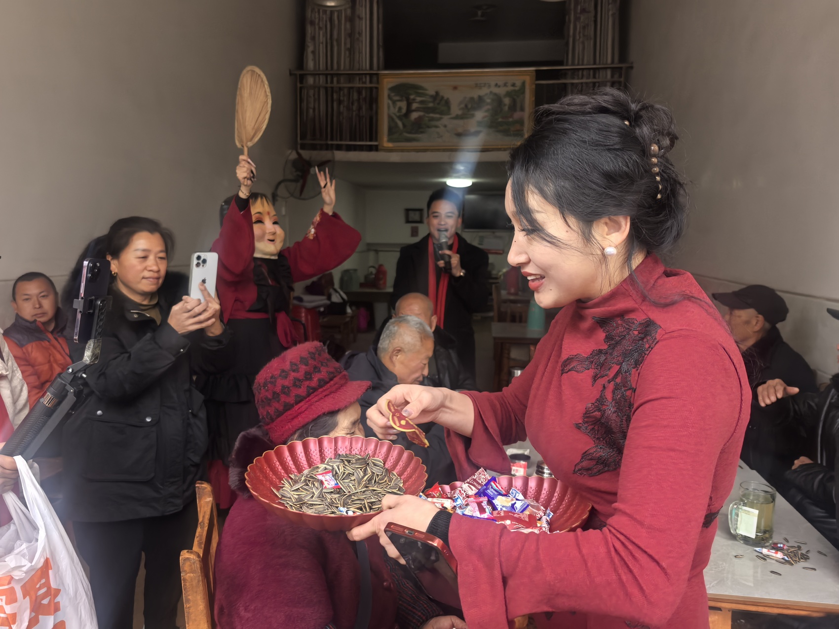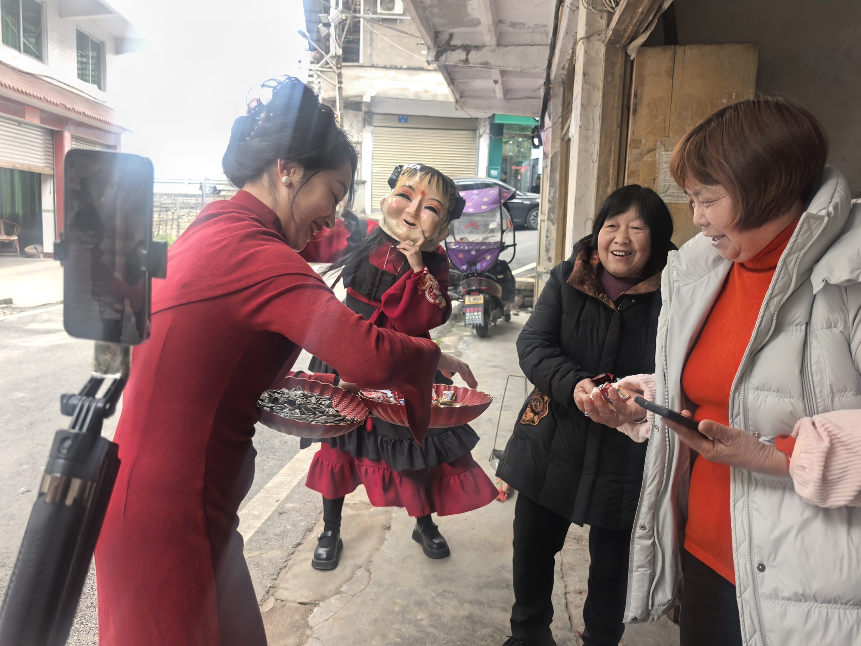 在街头派礼环节,“小酒窝”用甜美的歌声为乡亲们送上祝福;“天仙镇雯雯”向路人送出糖果瓜子及对联福字,引得过往群众纷纷驻足,引得线上线下笑声不断。