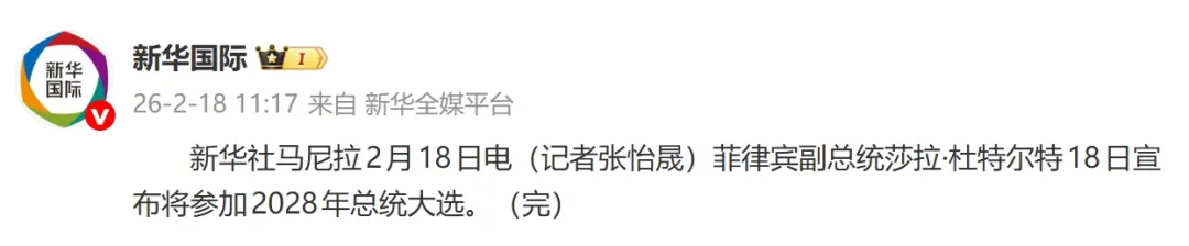 2月18日,@新华国际:菲律宾副总统莎拉·杜特尔特18日宣布将参加2028年总统大选。