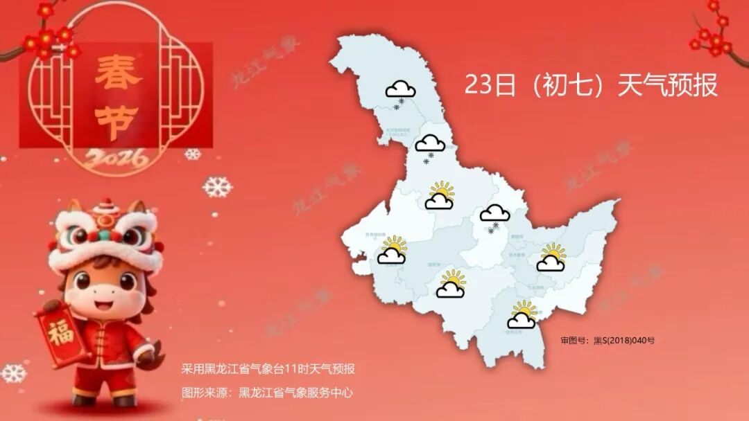 23日(初七):大兴安岭、黑河北部、伊春阴有小雪,其它地区晴有时多云。