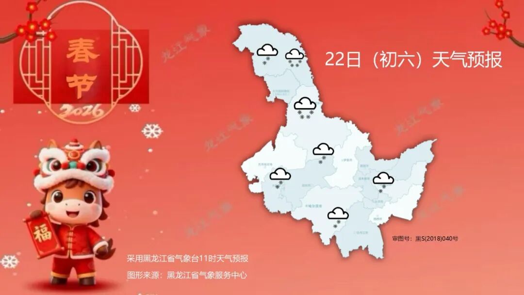 22日(初六):大兴安岭东部、黑河北部阴有中雪,局地有大到暴雪,其它地区阴有小雪,南部地区部分时段有雨夹雪。