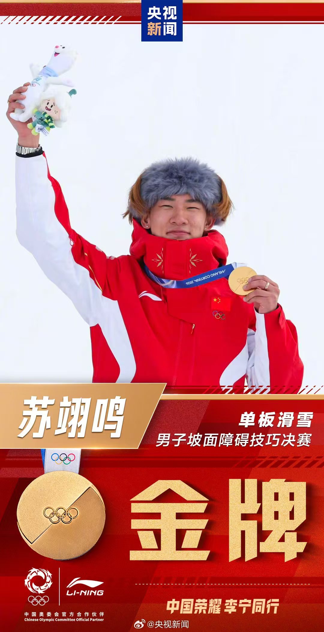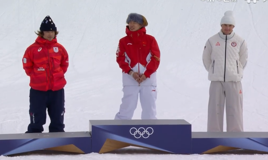 义勇军进行曲在利维尼奥雪上公园奏响,挂在苏翊鸣胸前的金牌在利维尼奥的阳光下金光闪闪。