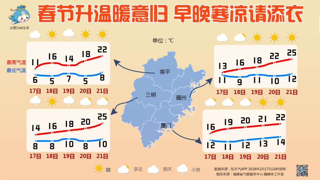 气温方面,天的气温依旧较为低迷,不过好在未来春节期间,全省最高温度持续波动走高,并且随着天气转晴,体感上也会变得更温暖舒适一些,但早晚依旧寒凉需要穿得保暖厚实。