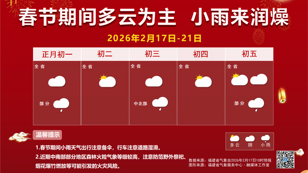 总体来看,春节期间以多云晴好天气为主,但偶有小雨来扰,尤其是中北部地区。朋友们春节期间出门走亲访友时,需注意备伞以防不时之需,道路湿滑,雨雾天气能见度下降,行车要注意安全。