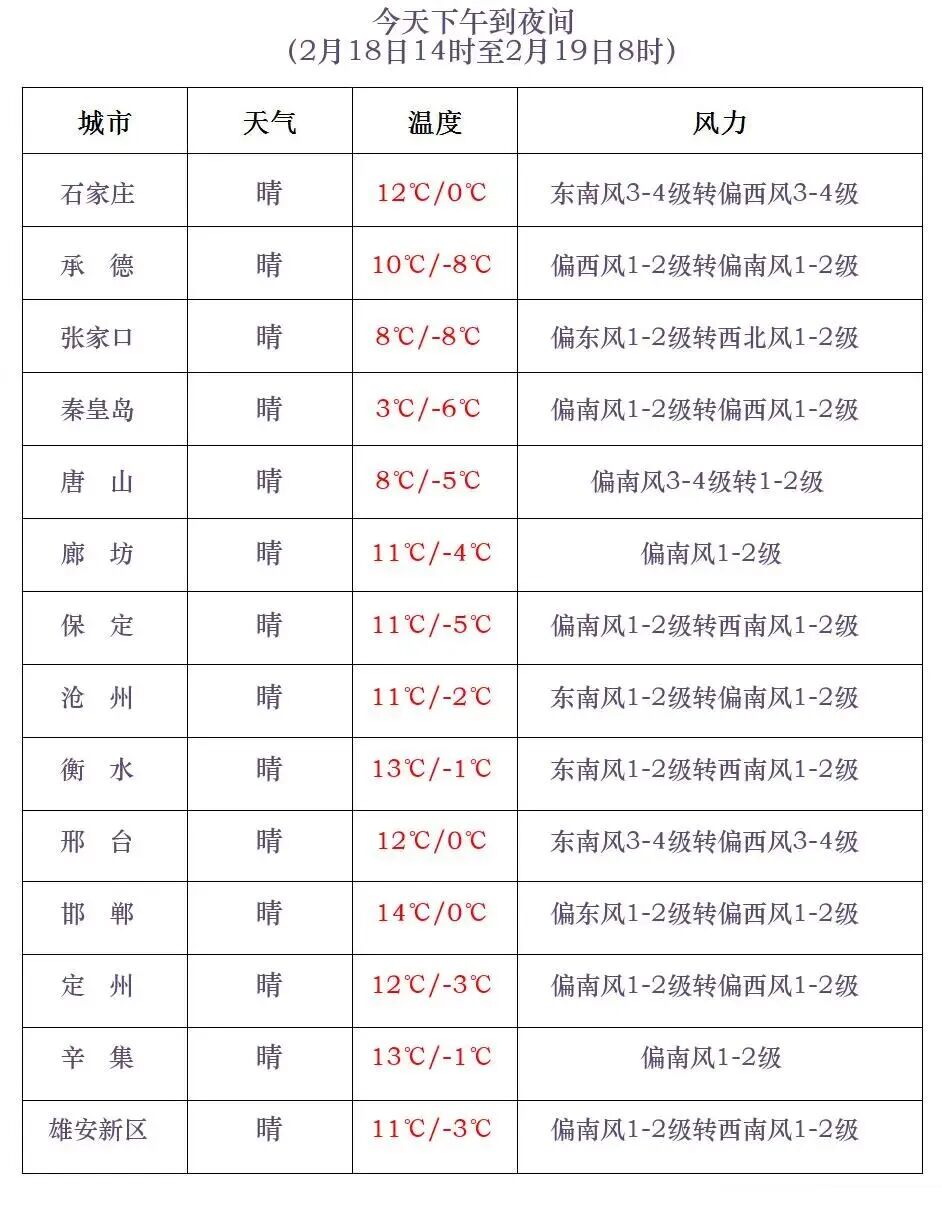 河北省气象台2026年2月18日11时发布天气预报: