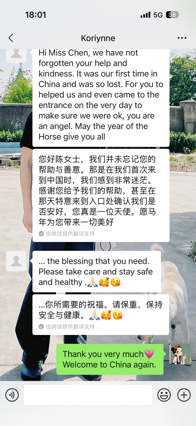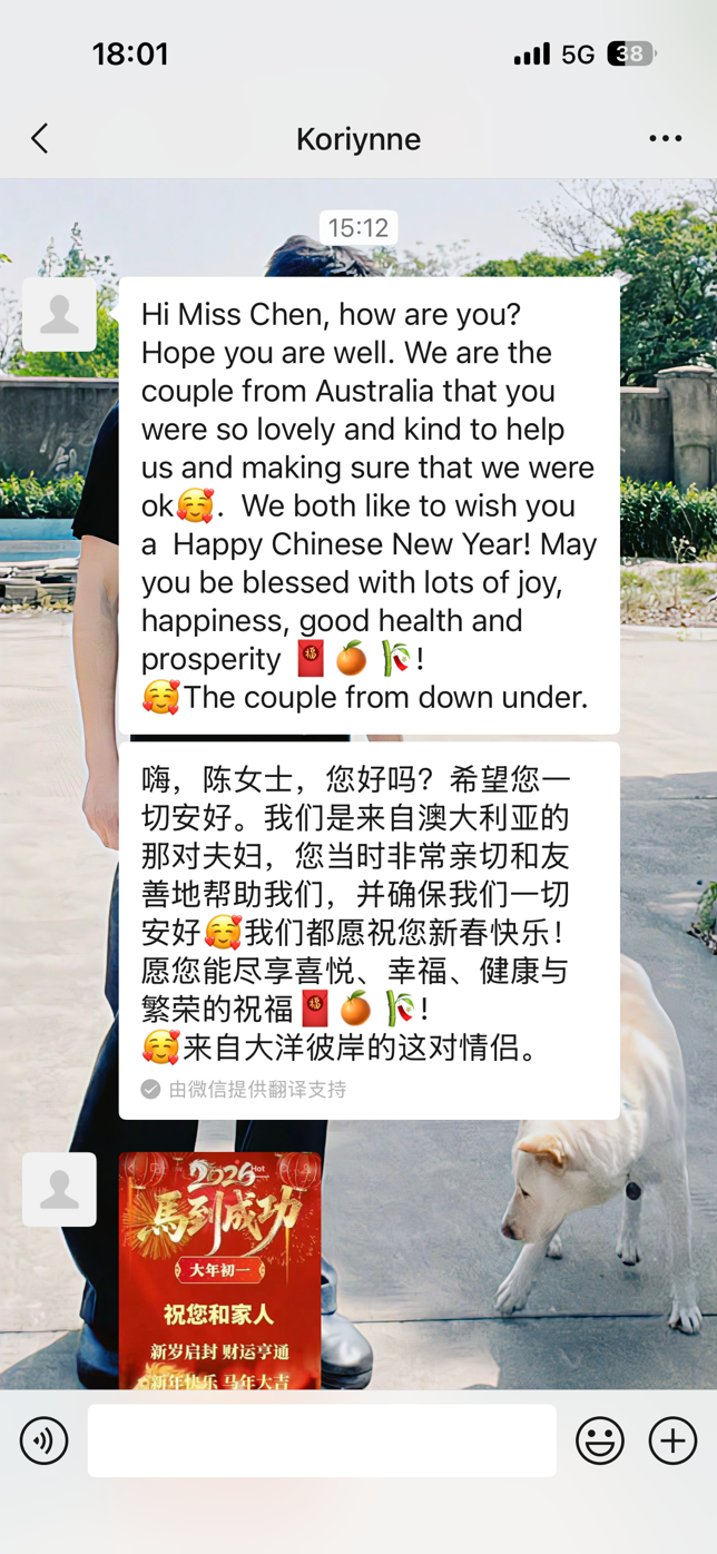 这份贴心的帮助让这对澳大利亚夫妇记了许久。为表示感谢,他们特意注册了微信,在中国新春佳节时发来祝福,称她是“降临身边的天使”,祝愿她在马年喜乐安康、万事顺遂。收到祝福后,陈佩佳也向夫妇俩送上了新春回礼,热情邀请他们再次来华旅行。